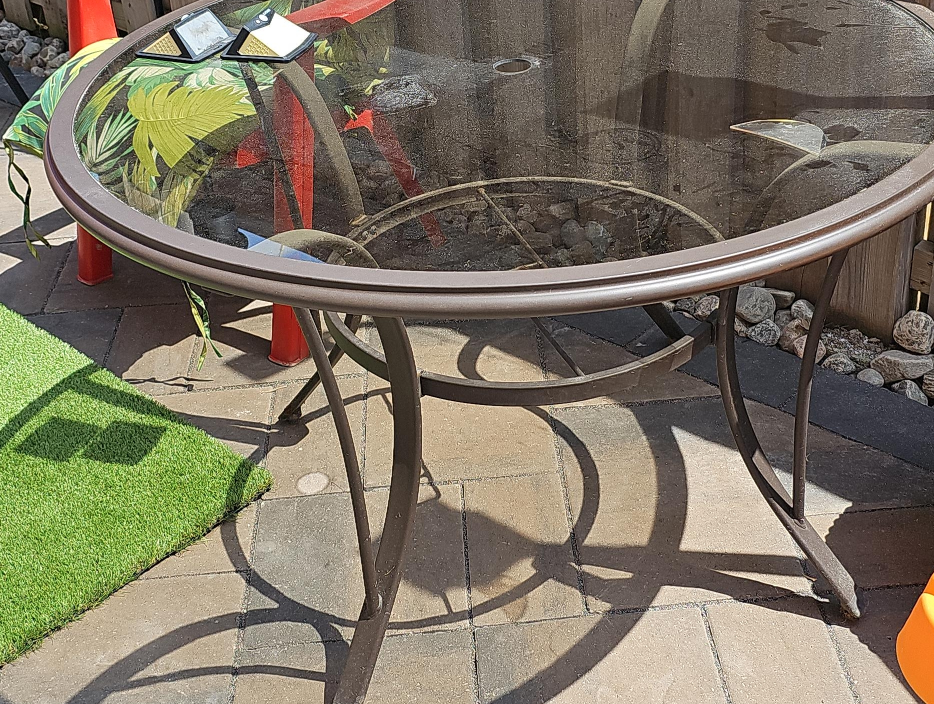 Table with glass top and metal frame. Featuring a round shape and a hole in the center. A great spot for enjoying a quiet morning coffee. Table only.