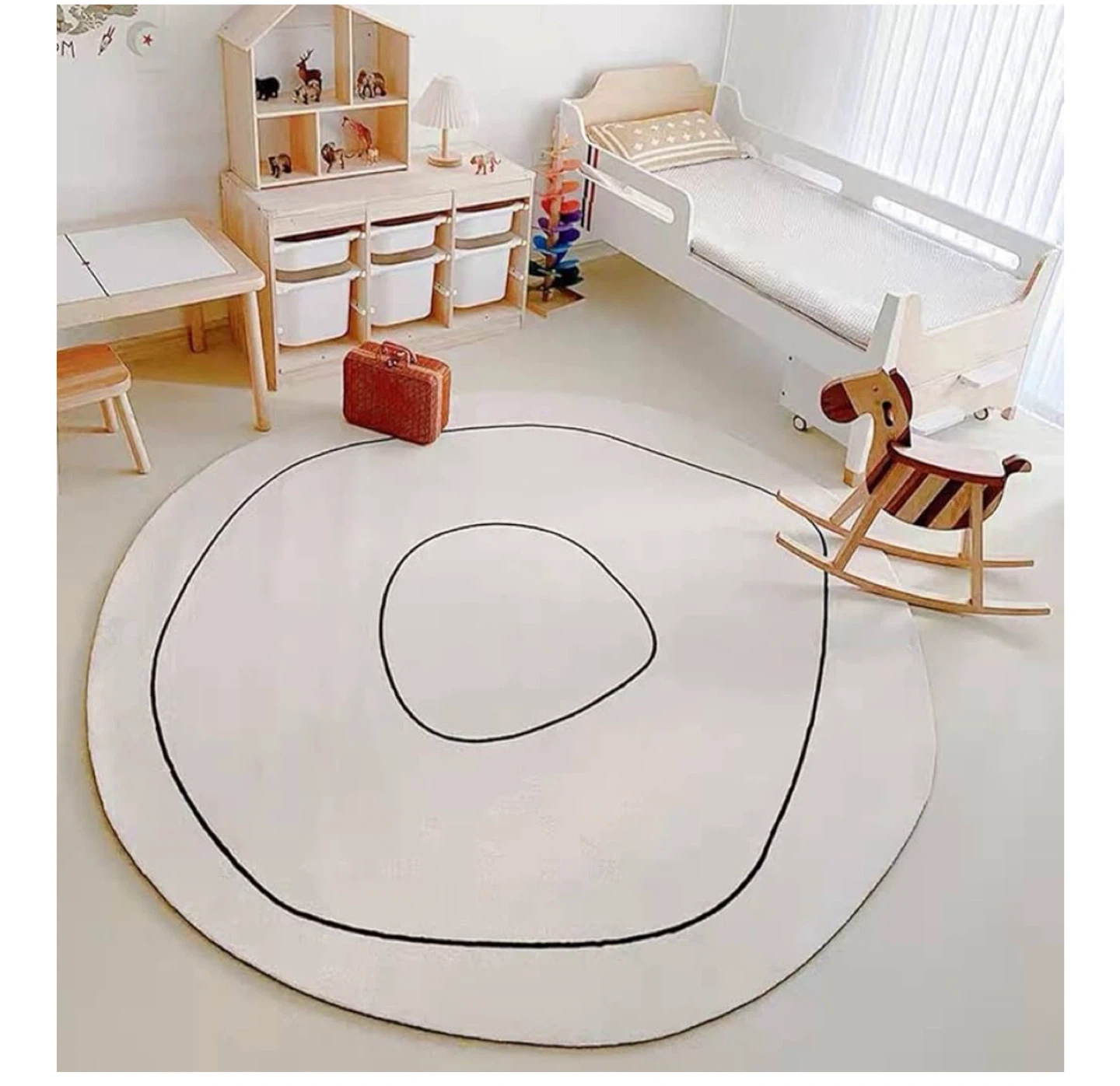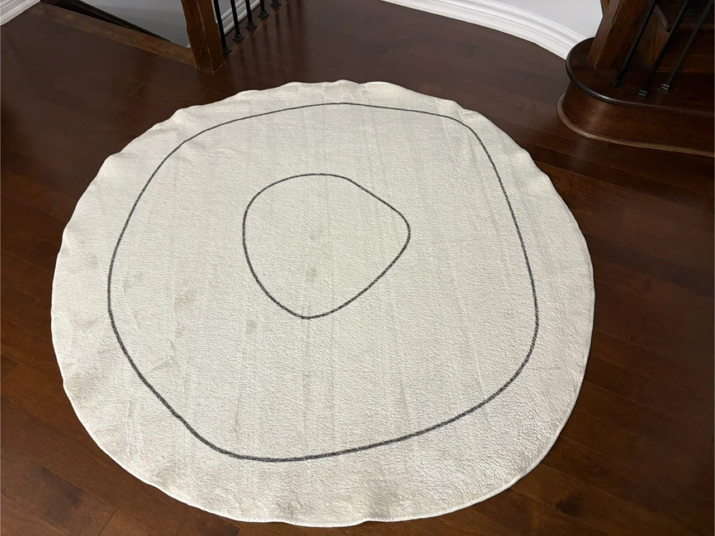 A lovely round rug in a cream/white colour with a simple black design. It would look great in a kids room or living room! The rug is in great condition and has no stains or marks. It's made of a soft material that's comfy to walk on. 6ft round