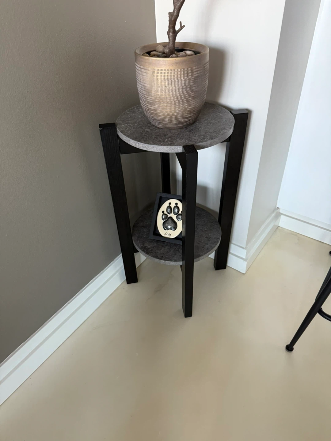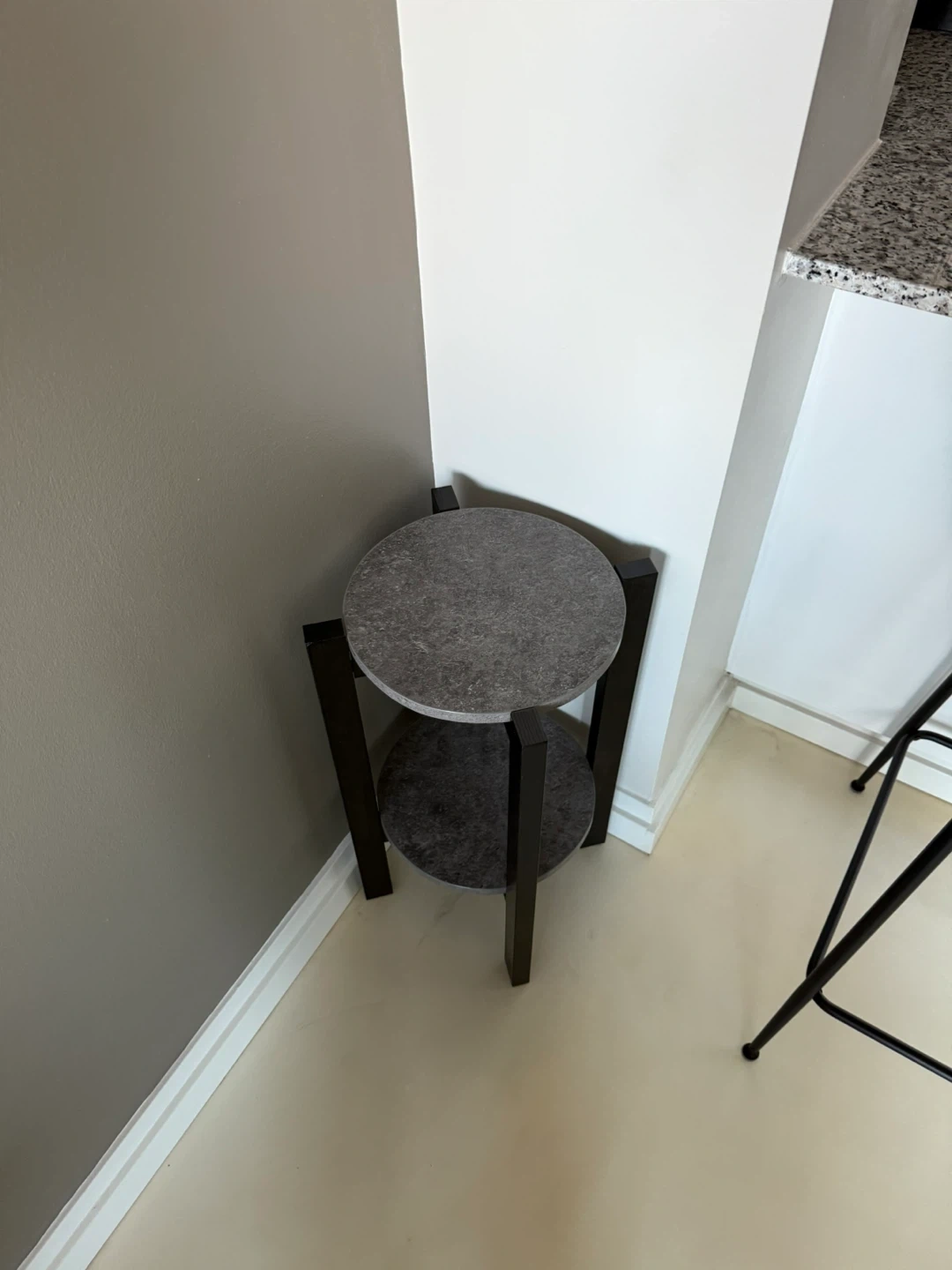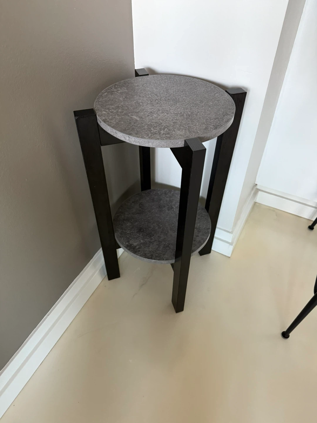 Looking to sell this cute two-tier round side table! It's in perfect condition and would look perfect in a living room or bedroom. It has a grey concrete looking top and bottom (MDF) and dark brown legs. Perfect for displaying plants or other decor!