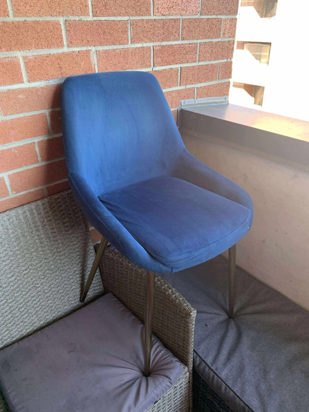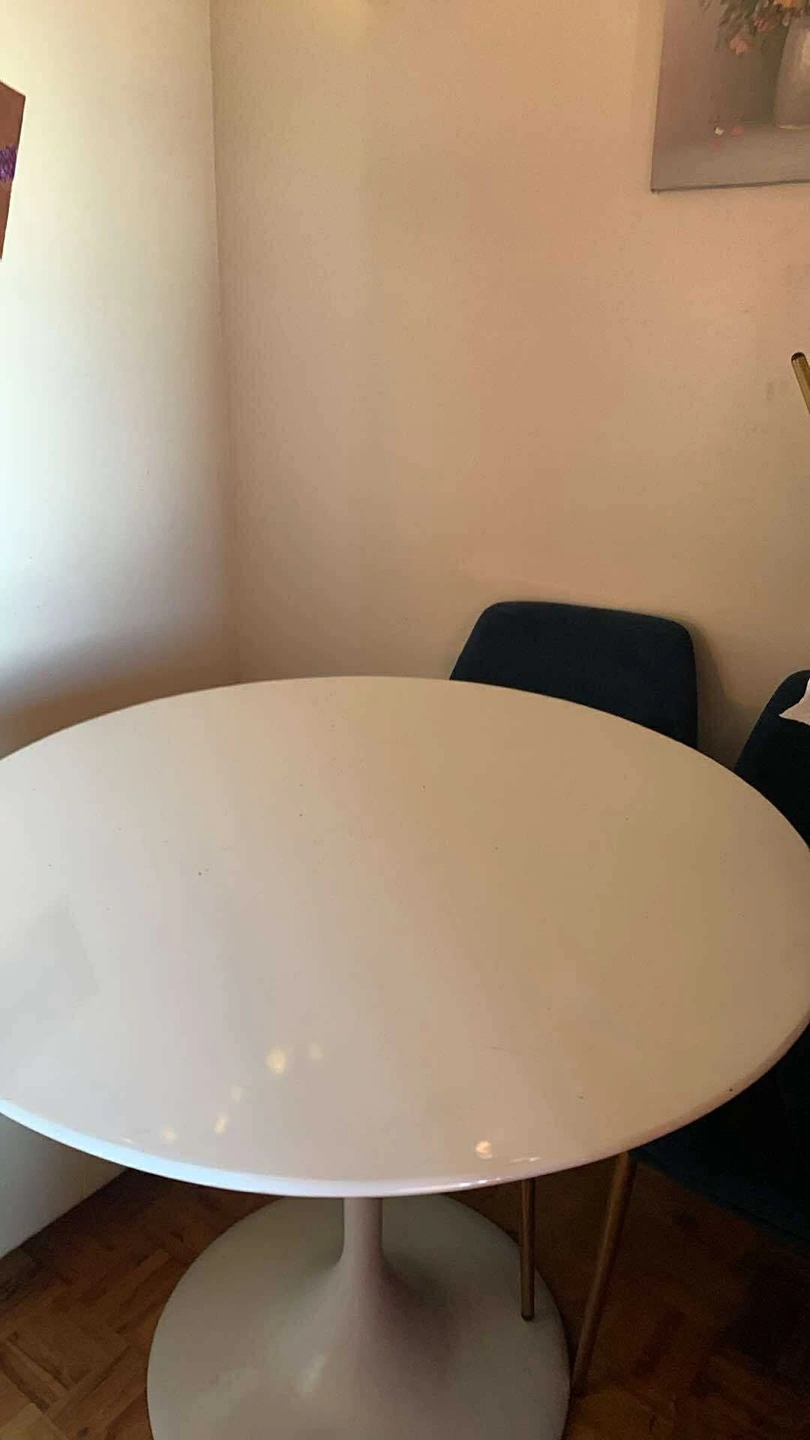 Selling a stylish round table with a white top and a sturdy base, perfect for a modern dining space or kitchen. It comes with a comfortable blue velvet chair that complements the table beautifully. This set is in great condition and ready to enhance your home decor