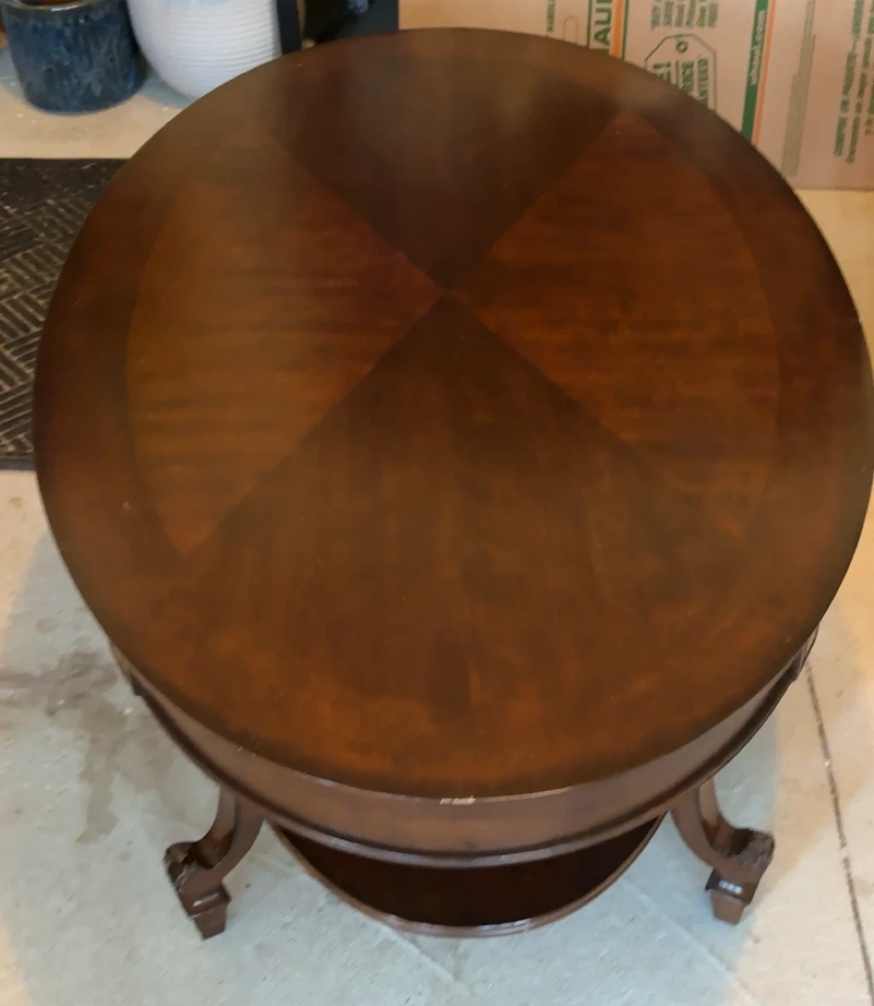 Here's a lovely round coffee table with a classic design! It features a rich, dark wood finish and a convenient lower shelf for extra storage or display. Sold wood light damage on edge and foot. Just under 4ft long 2.5ft wide.
