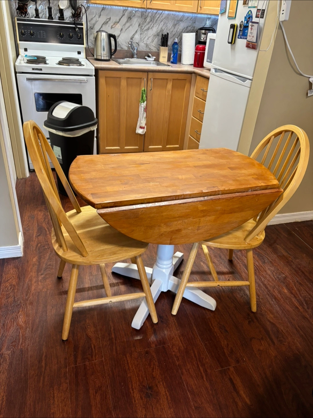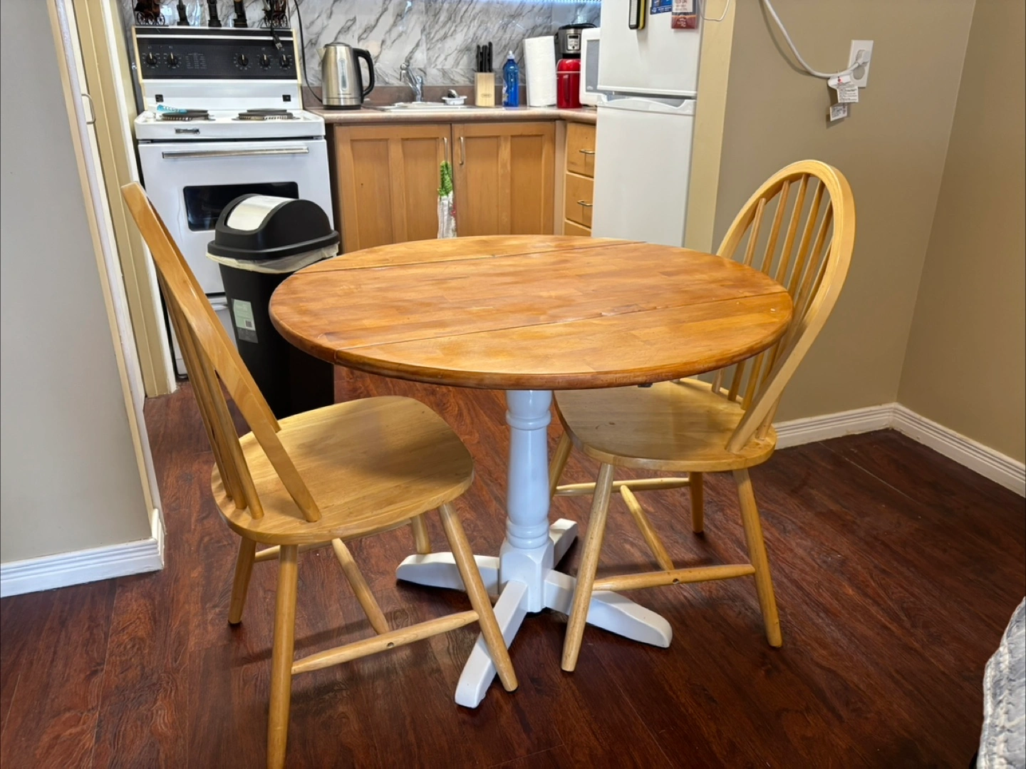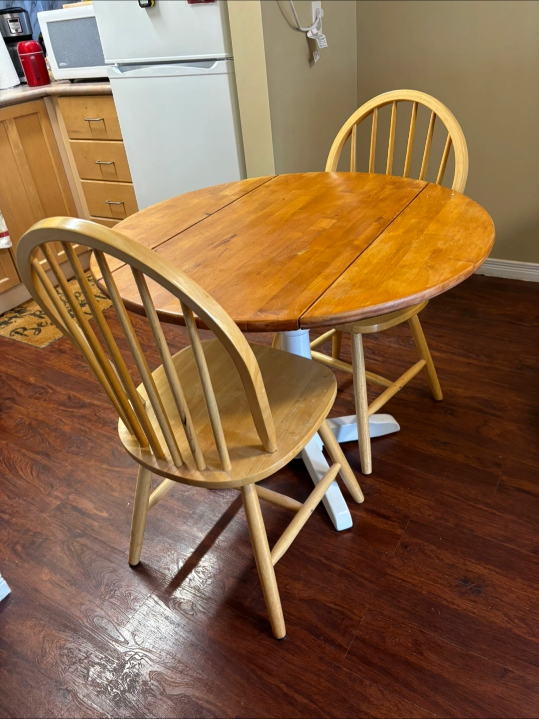 A lovely round wooden dining table that's perfect for small spaces! It comes with two matching chairs. The table has a drop-leaf design, so you can easily expand it when needed. It's in great condition and ready for a new home!