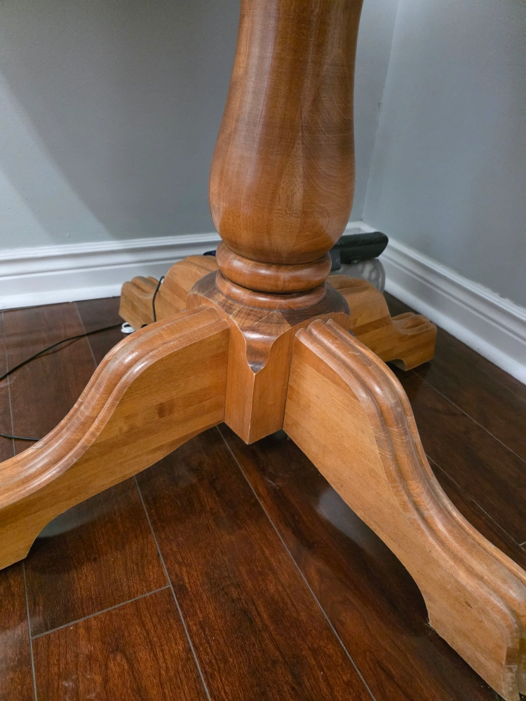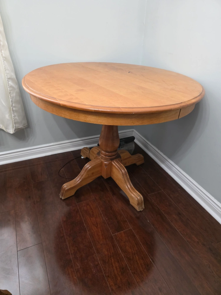 Selling a round wooden dining table. It's a nice, sturdy table that would be great for a smaller dining space or kitchen. The table is in good condition and has a classic design that would fit with many decor styles. It's perfect for family dinners or game nights! Solid wood, heavy, it can be separated into 2 pieces, pick up only