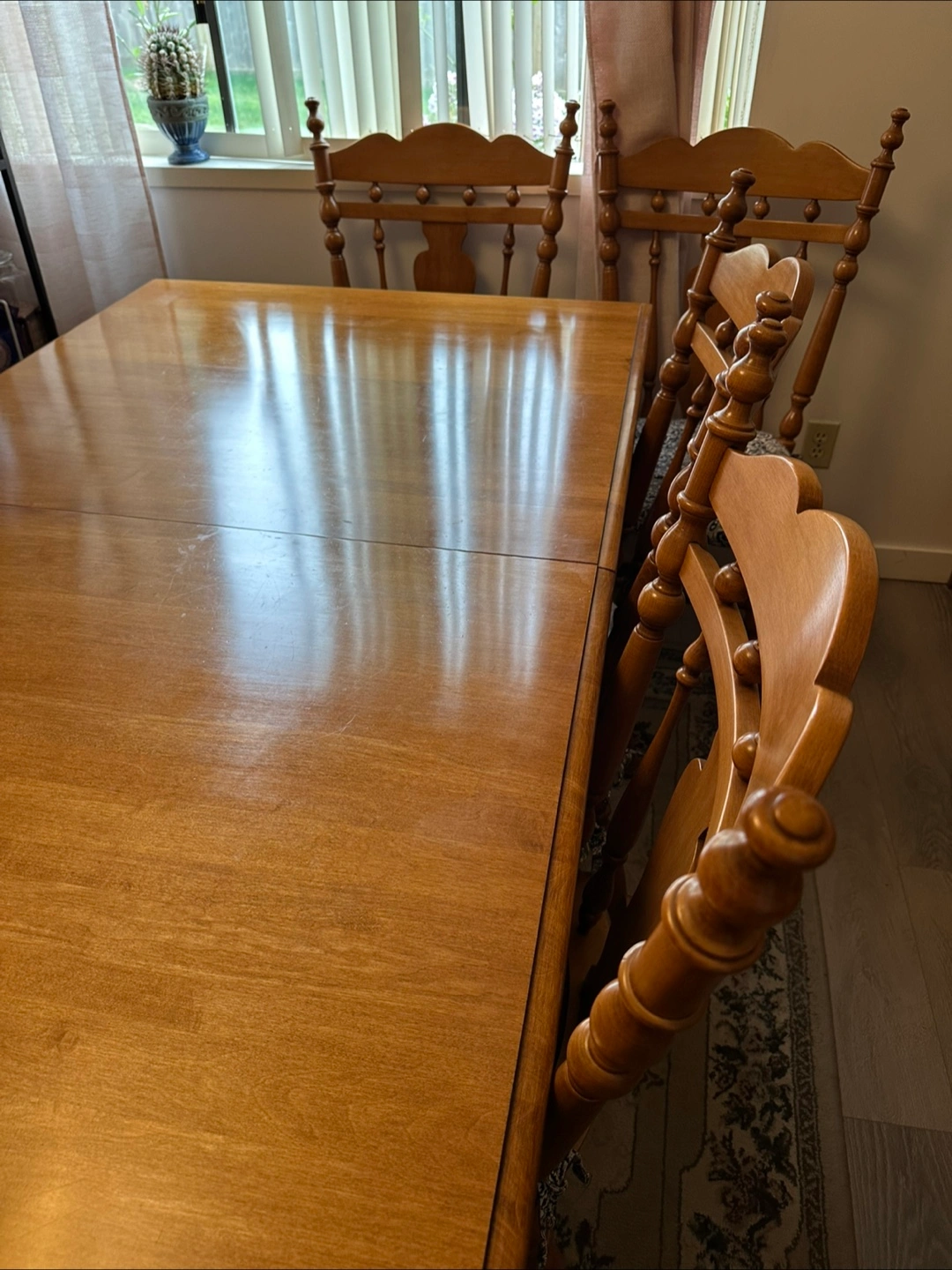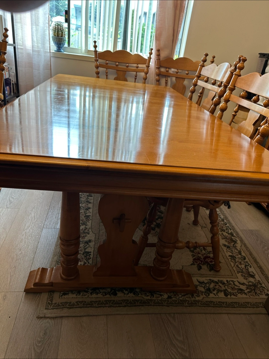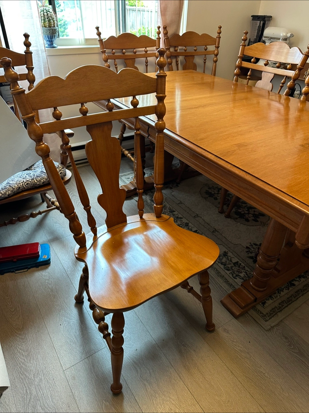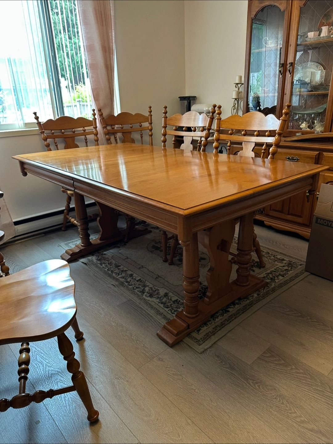 Beautiful Roxton Heritage Collection extendable dining table with 2 leaves and 8 chairs - 6 regular, 2 captains chairs (with arm rests) It is in great condition and is made of solid maple wood. Table is 6 feet long, each leaf is 1 foot, making it up to 8 feet. It is 30 inches tall and 40 inches wide. It's perfect for family dinners or entertaining guests. The table is extendable, offering flexibility for different occasions. The chairs are sturdy and comfortable.