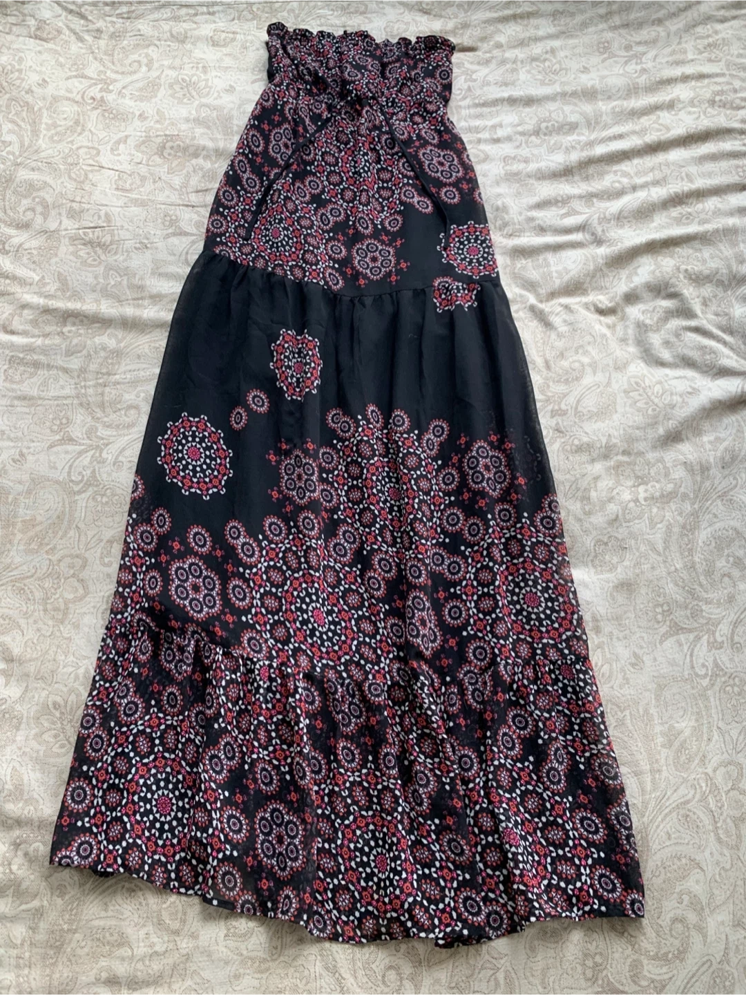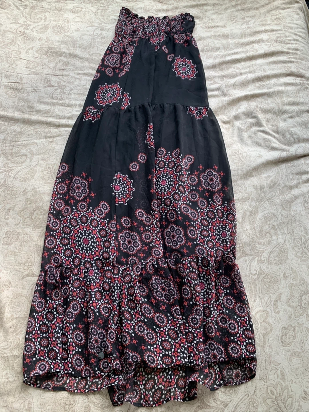 Selling a lovely Roxy maxi dress! It features a beautiful floral pattern in black, red, and white. This dress is a size small and would be a great addition to your wardrobe for summer days or evenings out