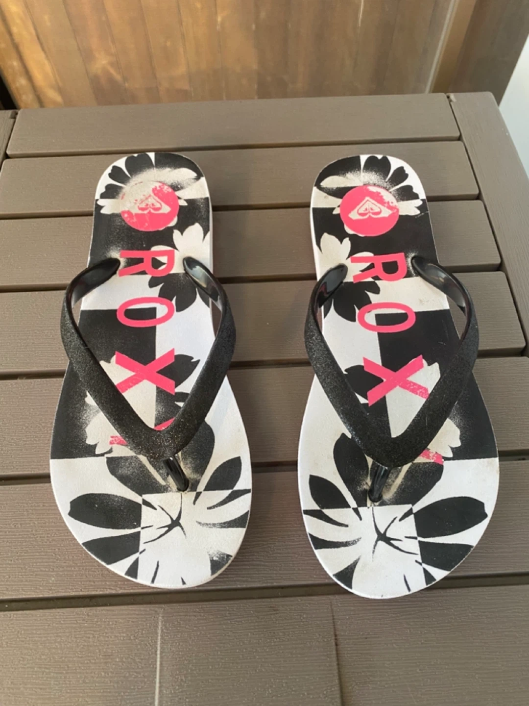 Cute Roxy flip flops with a black and white floral and checkered pattern! Great for the beach or just kicking around this summer