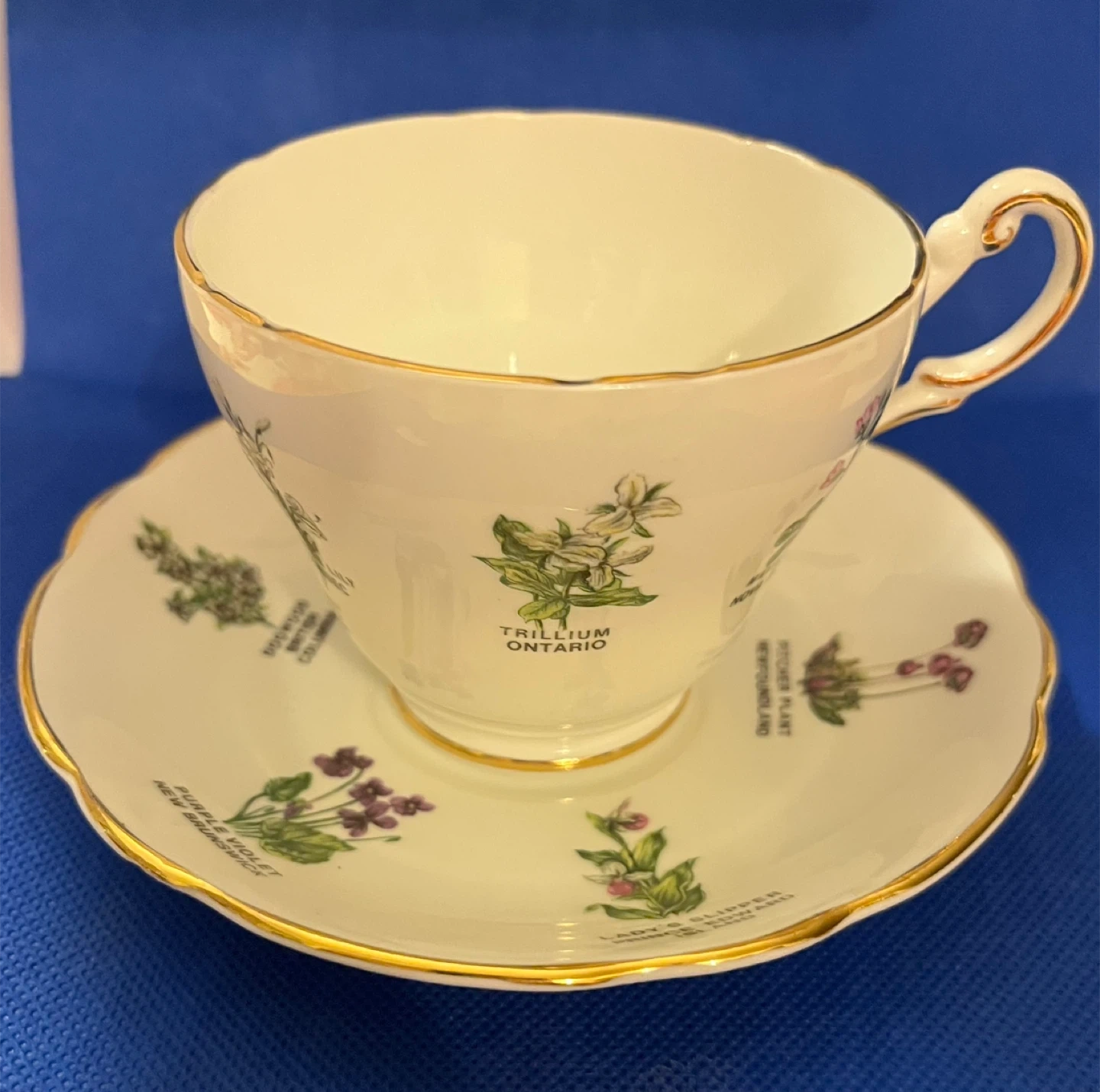 Beautiful Royal Darwood Bone China cup and saucer set. The cup and saucer feature various Canadian provincial flowers, making it a unique and charming addition to any collection. The set is in excellent condition and ready to be enjoyed! No chips