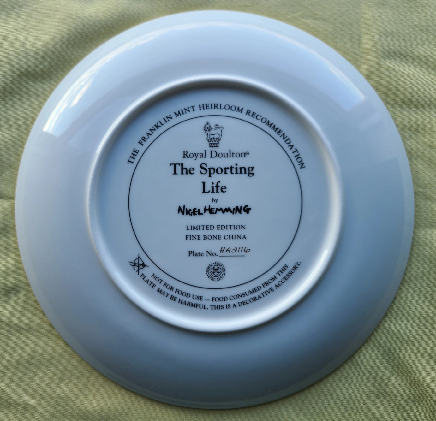 Selling a Royal Doulton collector's plate titled 'The Sporting Life' by Nigel Hemming. This fine bone china plate is a limited edition from The Franklin Mint Heirloom Recommendation collection. Plate number HA0116. Please note this is a decorative accessory and not for food use. **comes with packaging. Never been displayed** Pick up only. No delivery.