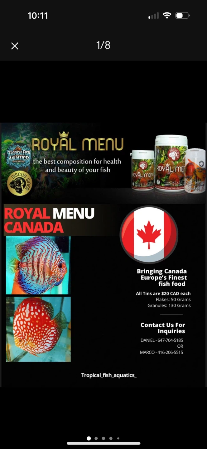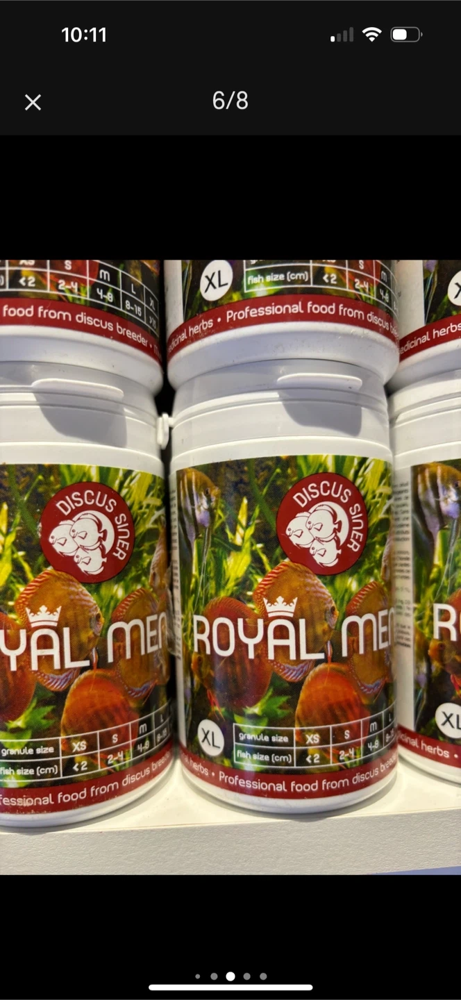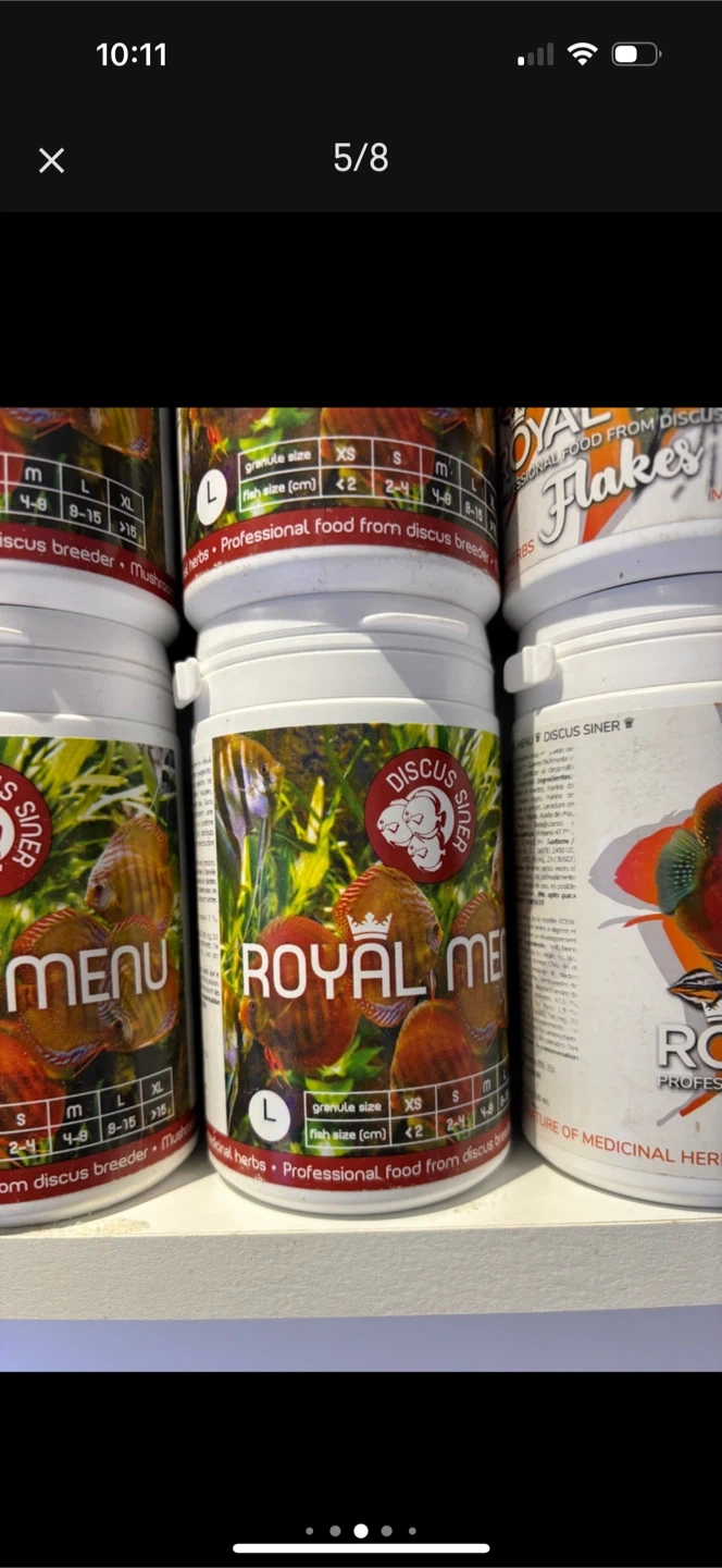 PRICE WILL BE GOING UP SOON SO GET THEM WHILE SUPPLIES LAST Hi we have Royal menu fish food excellent for discus and tropical fish best price anywhere only $20 each Has probiotics which excellent for fish Amazon sells it for $28.99 plus tax Really great for discus fish but Good for all fish , you will not get this deal anywhere else (while supplies last) Received a new shipment of X-Large Thank you Royal menu (medium , large and X~Large) Composition: Krill, squid meal, insect protein, fish meal, rice protein ,rye, rice, wheat, shrimp meal, dried algae Chlorella and Spirulina, salmon oil, brewer's yeast, zeolite, mixture of medicinal herbs, mushroom Shiitake, Chia seed oil, red paprika pigment, amino acids, prebiotics, mannan-oligosaccharides and beta-glucans, probiotics. Royal menu flake Ingredients: Krill meal, squid flour, insect proteins,Rice protein, fish meal, rye, rice, wheat, black mosquito larvae, crustacean flour, dried algae Chlorella and Spirulina, salmon oil, brewers yeast, zeolite, medicinal herbs mixture, Shiitake mushroom, Chia seed oil, red pepper pigment, amino acids, prebiotics, beta glucans and mannan oligosaccharides, probiotics. Royal menu red( medium ) Ingredients: Squid flour, Fish meal, Wheat gluten, Rice protein, Rye, Wheat, Rice, Salmon oil, Insect protein, Krill, Crustacean flour, Brewer's yeast, Dried algae, Chlorella, Spirulina, Medicinal plants mixture, Shiitake mushroom, Zeolite, Chia seed oil, Red pepper carotenoids, Fodder limestone, Amino acids, Prebiotics, Beta Glucan, Mannan oligosaccharides, Astaxanthin, Canthaxanthin, Beta Carotene, Lutein, Probiotics ,Flakes and XL only ty