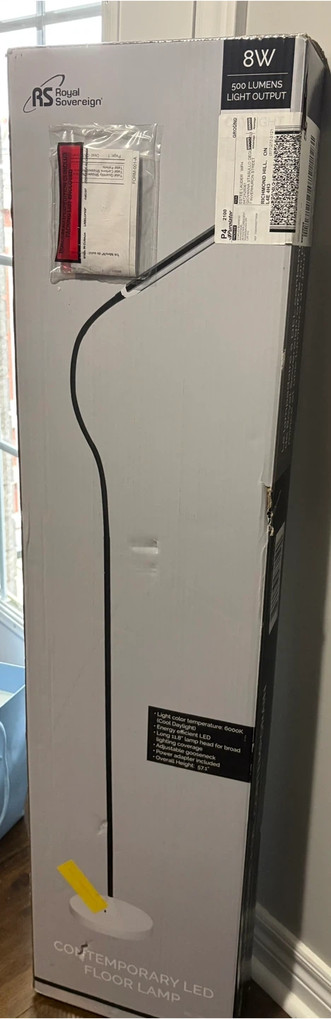 Selling a brand new Royal Sovereign Contemporary LED Floor Lamp! It's still in its original packaging. Key features include: - Light color temperature: 6000K (Cool Daylight) - Energy-efficient LED - Long 11.8" lamp head for broad lighting coverage - Adjustable gooseneck - Power adapter included - Overall Height: 57.1"