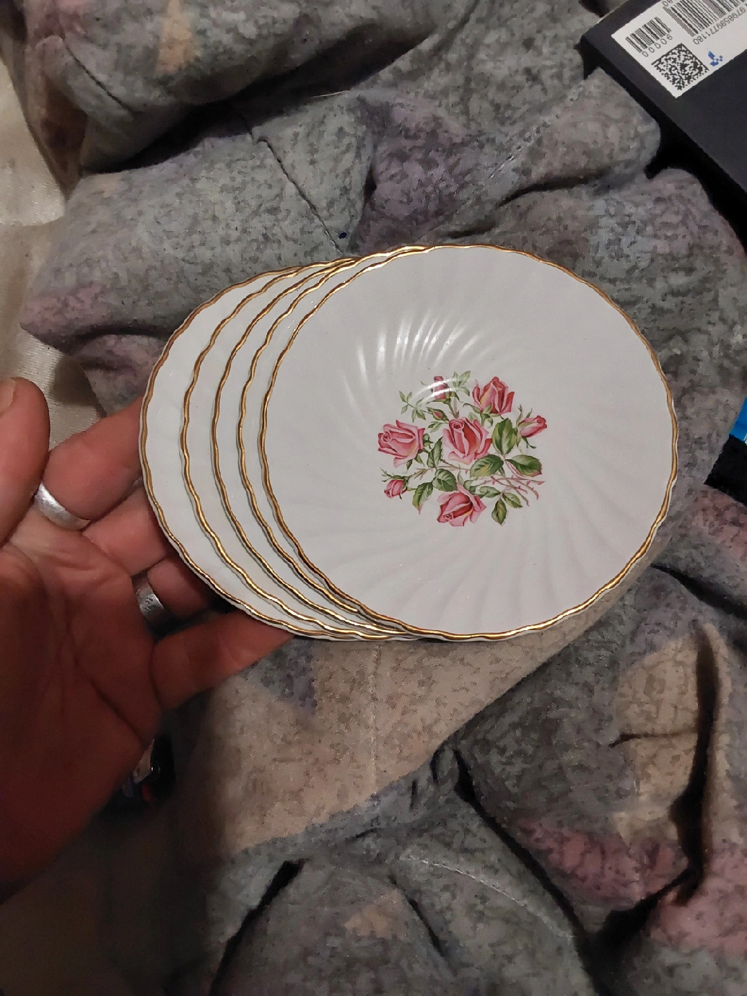 Selling a Royal Wesson Ironstone creamer and a set of saucers. The saucers are decorated with a rose pattern and have a 22kt gold trim. The set is in good condition and would be a lovely addition to any tea set Pickup only please. Sorry no holds.