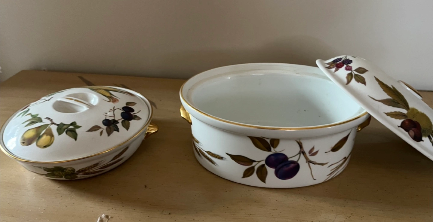 Two lovely Royal Worcester Evesham Gold pattern oven-to-table dishes. One round, one oval. Both feature a gold trim and fruit motif. Perfect for serving or storing.