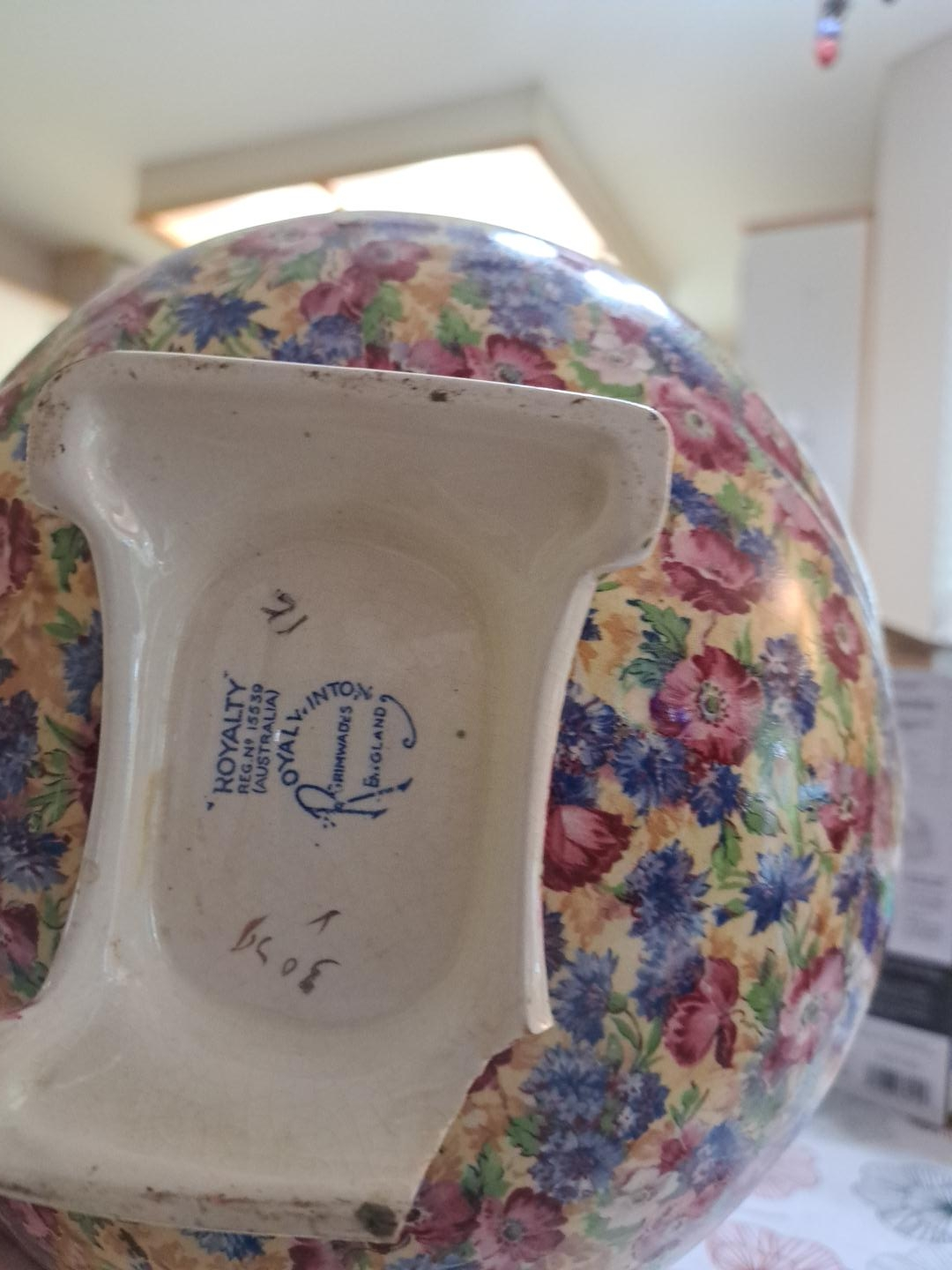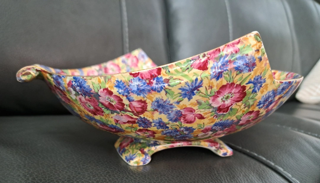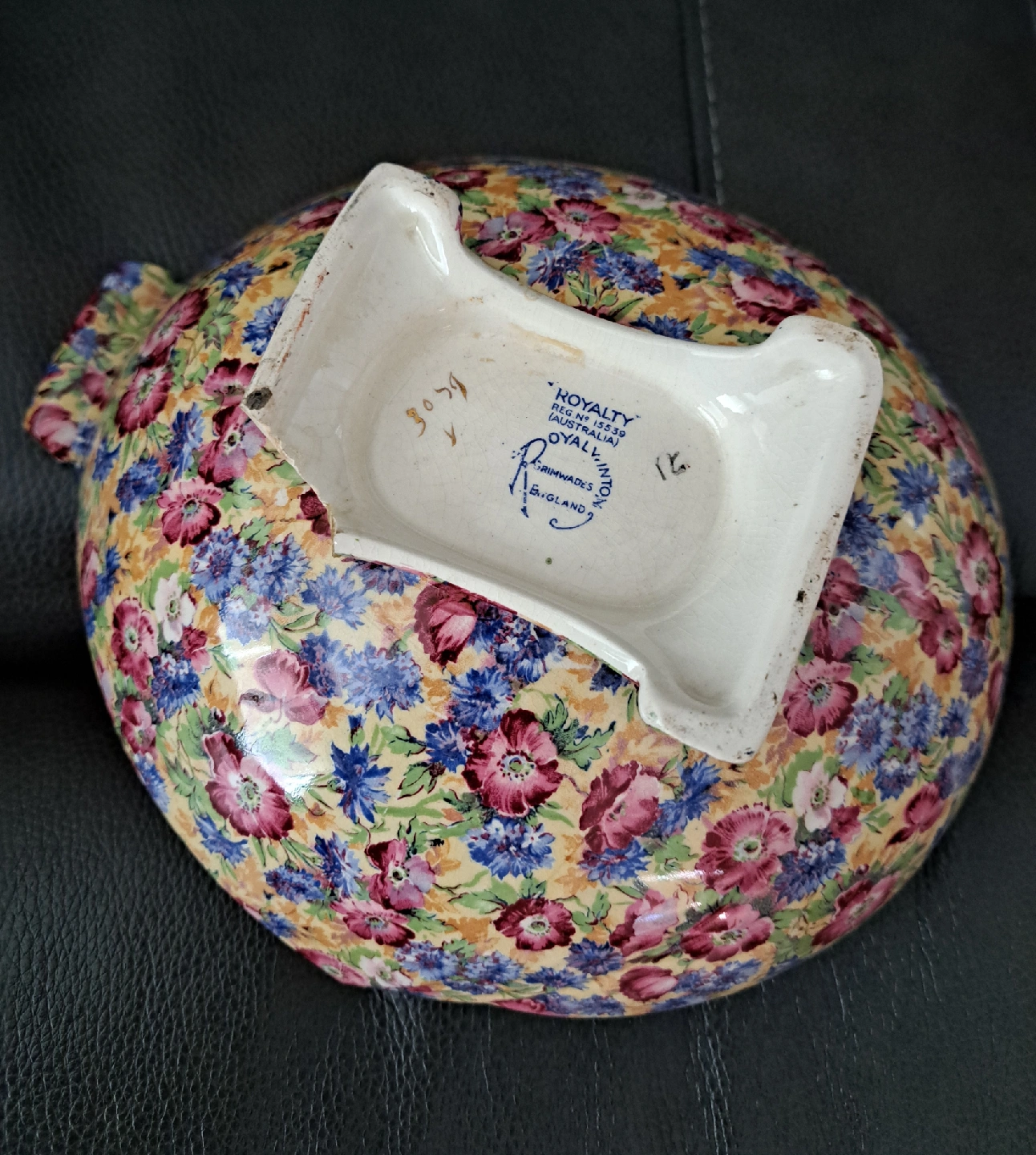 Selling a vintage 'Royalty' Royal Winton floral bowl. It has a beautiful floral pattern with pink and blue flowers on a yellow background. There is a chip on the base.