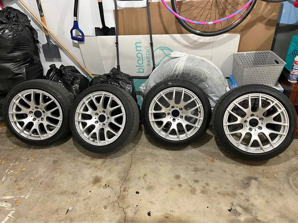 17x8 5X120 Offset 35 215/45/17 2 Tires has fender rubbings as seen on picture but still holds air and decent thread on all tires. Got the wrong size for my car. Can include 1 inch spacer to convert lug nuts pattern to 5X114.3 to 5X120 for wheels to fit Open to trades