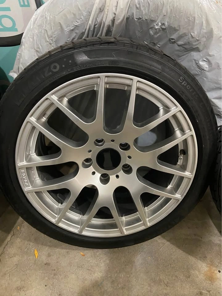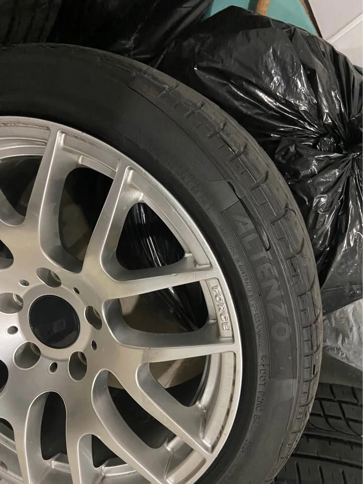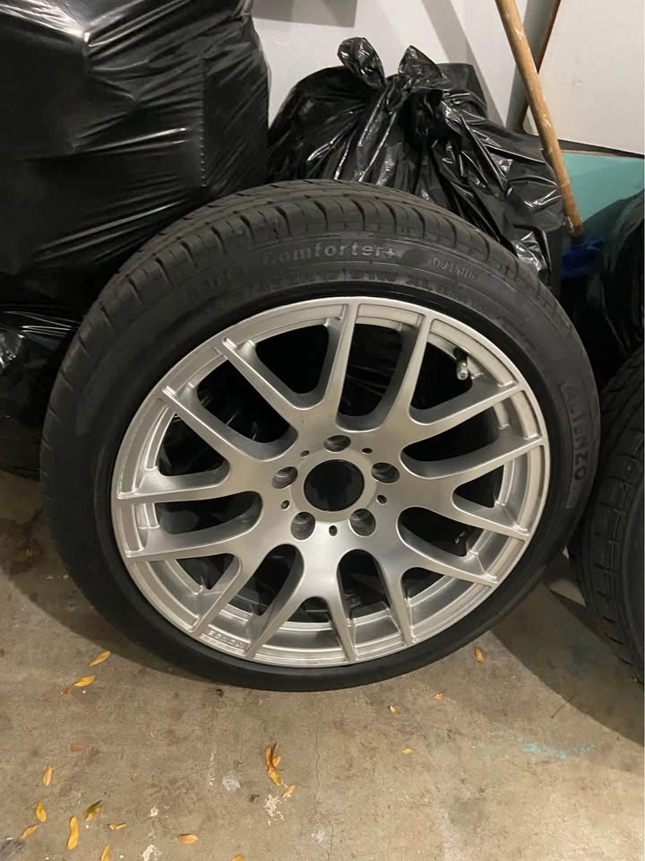 17x8 5X120 Offset 35 215/45/17 2 Tires has fender rubbings as seen on picture but still holds air and decent thread on all tires. Got the wrong size for my car. Can include 1 inch spacer to convert lug nuts pattern to 5X114.3 to 5X120 for wheels to fit Open to trades