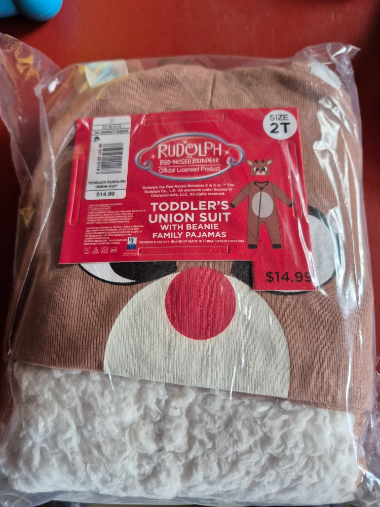 Super cute Rudolph the Red-Nosed Reindeer toddler union suit with beanie! It's a size 2T and comes in its original packaging. This family pajama set was originally bought for $14.99 and is an official licensed product.