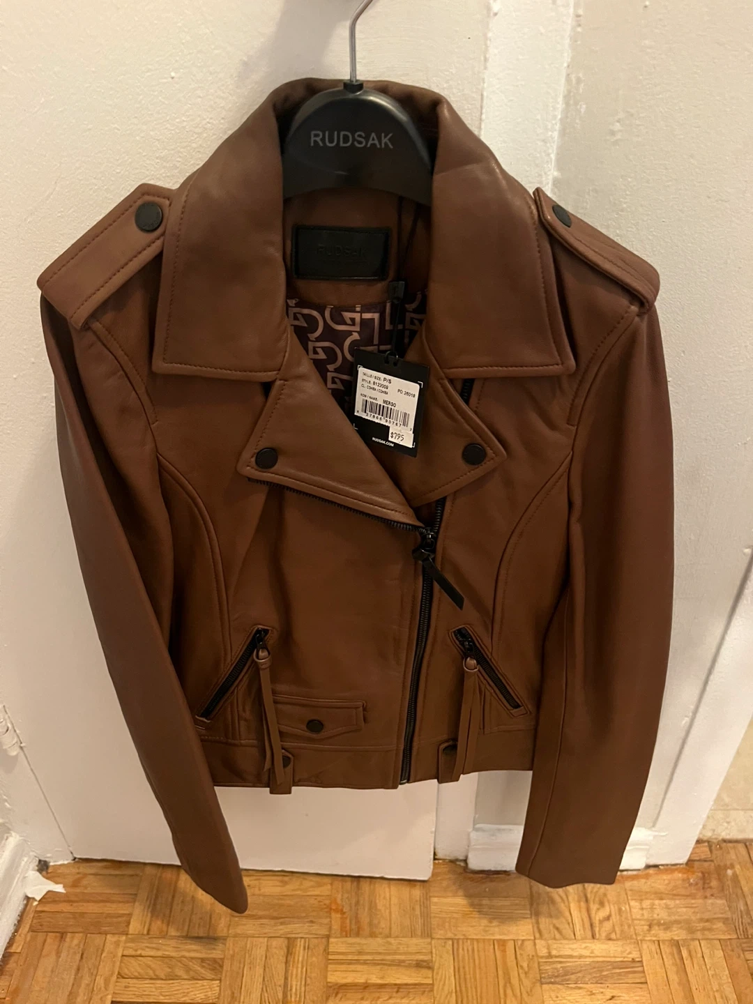 Selling a Rudsak Mergo leather jacket in a beautiful brown colour! It's a size P/S, which is equivalent to a small. This stylish jacket originally retailed for $795. It's in great condition and ready for a new home!
