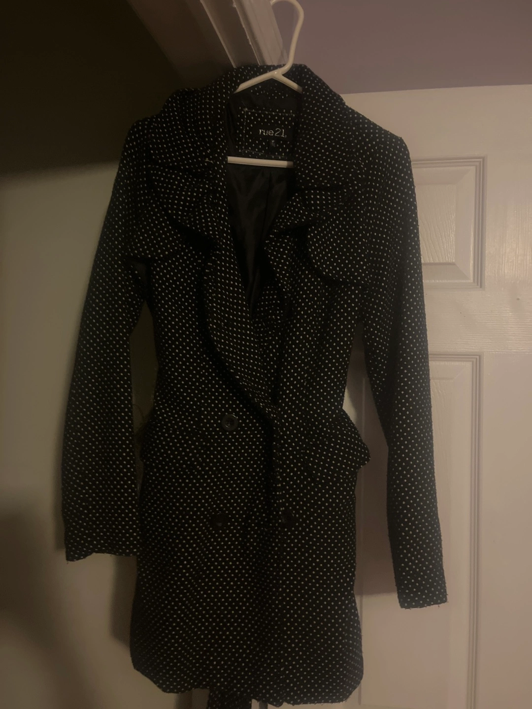 Women's coat, black with white polka dots. Long sleeves, belted waist. Features a collared neckline.