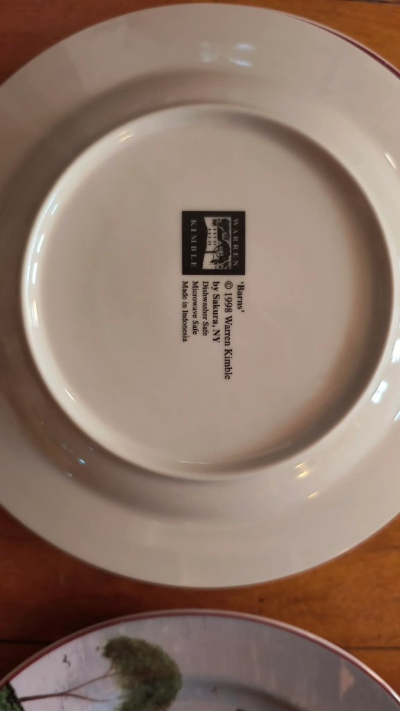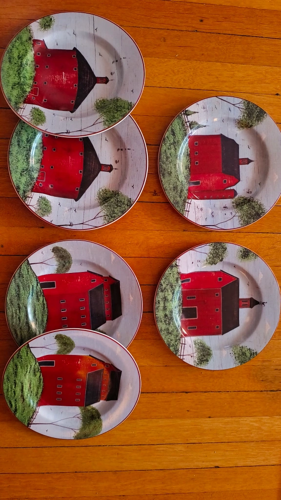 6 Warren Kimble 'Barns' salad plates, dishwasher safe.