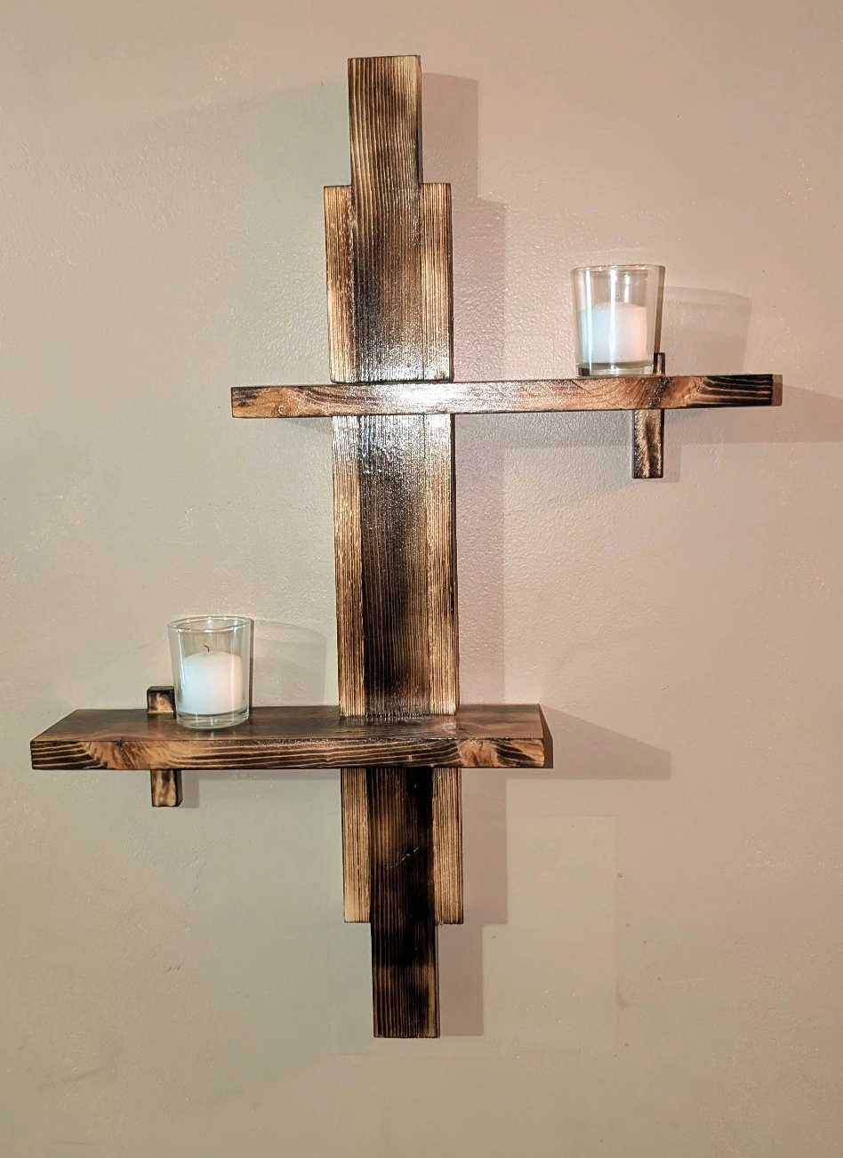 This handcrafted wall-mounted shelf is ready to add character to your space. With a bold asymmetrical design and a rich burnt wood finish, it’s both functional and artistic. Two shelves offer just enough room to display your favorite small decor, plants, or curios—without giving clutter a chance. Dimensions: 18" wide × 24" tall × 3.5" deep. Perfect for hallways, cozy corners, or anywhere that needs a little rustic flair.