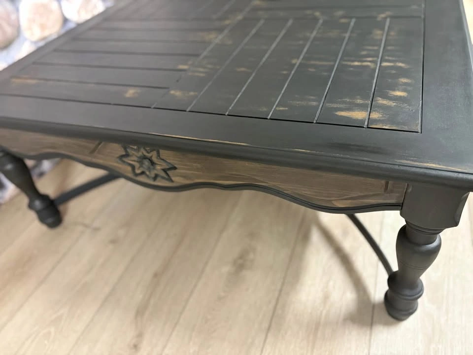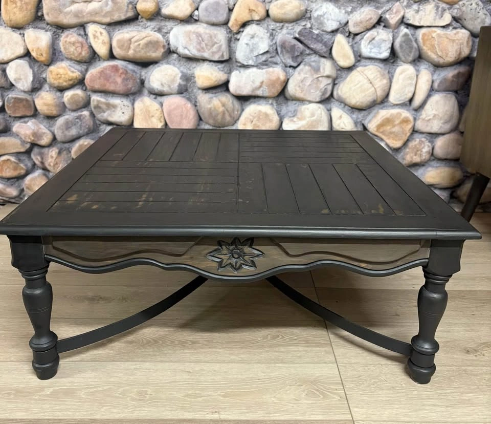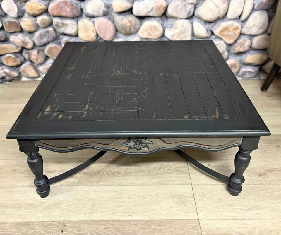 Refinished solid pine coffee table painted in Fusion Mineral Paint Cast iron, slightly scuffed in the right places to add rustic charm and coated with Fusion Stain and finishing oil in Ebony to give it some shine! 38” square . 15” Tall. Pick up in Russell.
