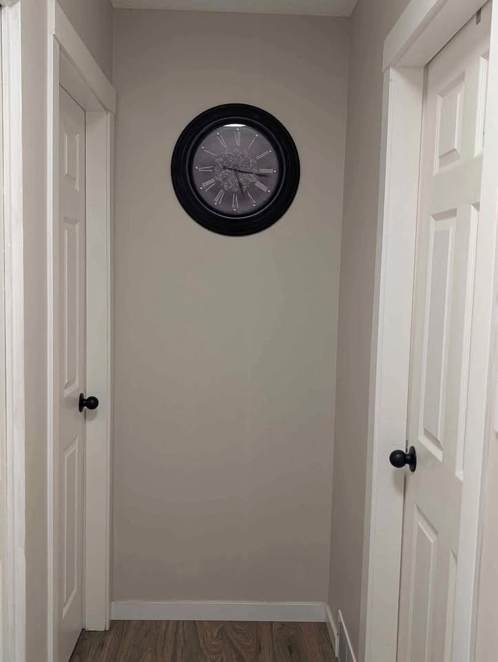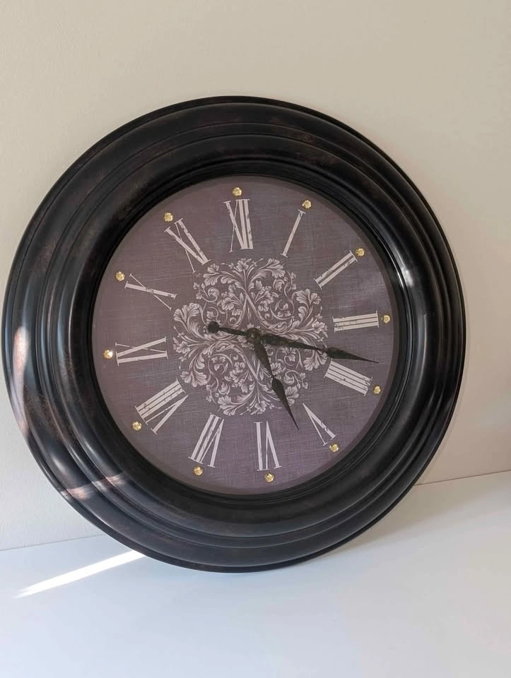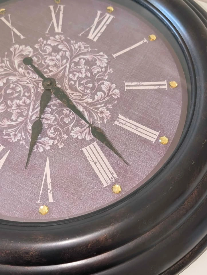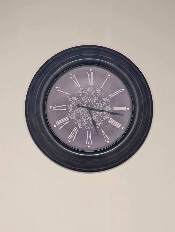 Rustic farmhouse wall clock. Large and decorative, with a beautiful floral pattern and classic Roman numerals marked by small golden jewels. Perfect for a living room, kitchen, or entryway. Measurements 20" Price 15 In great condition cash only