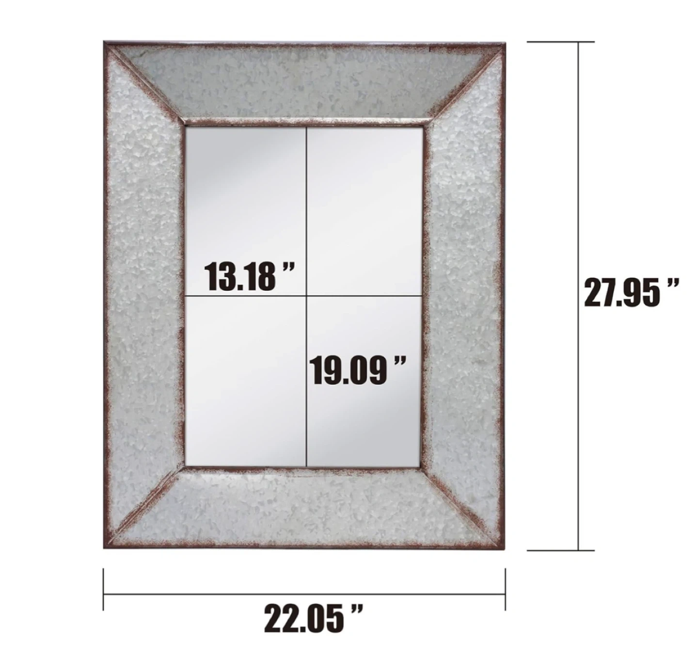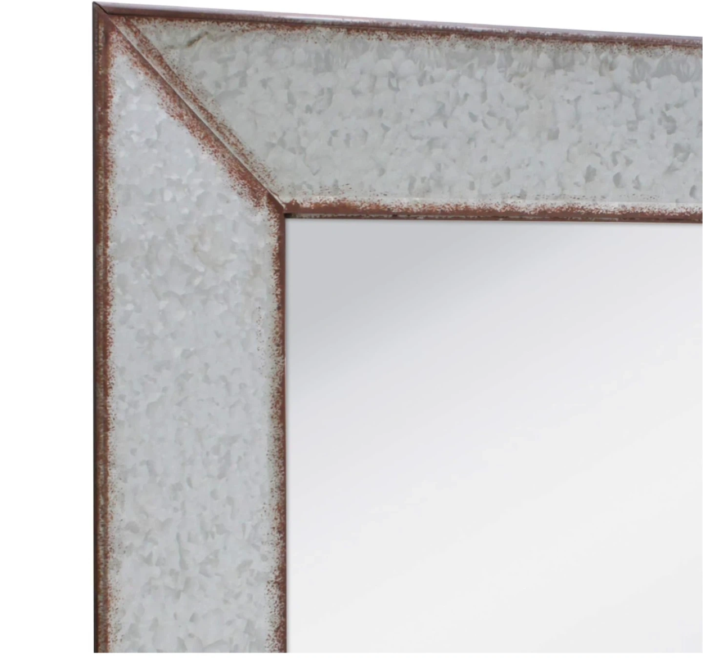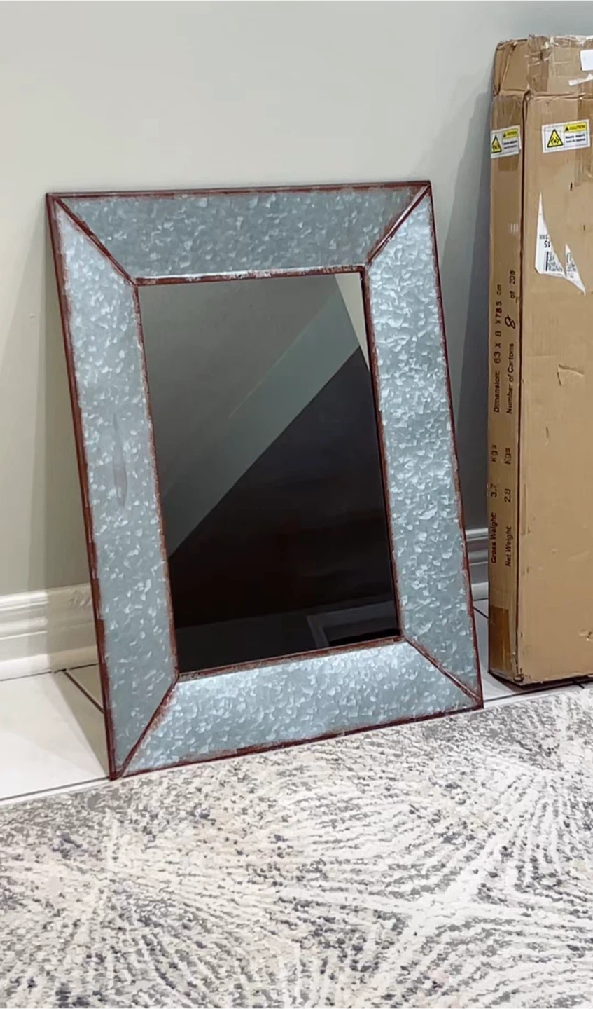 Add a touch of rustic charm to your home with this metal-framed mirror! The frame has a galvanized metal look with a slightly distressed, rusty edge. Dimensions: - Height: 27.95 inches - Width: 22.05 inches - Mirror area: 13.18" x 19.09" Pickup bovaird and Great Lakes Brampton