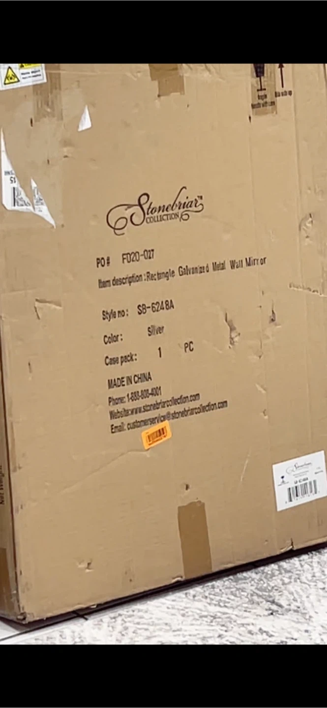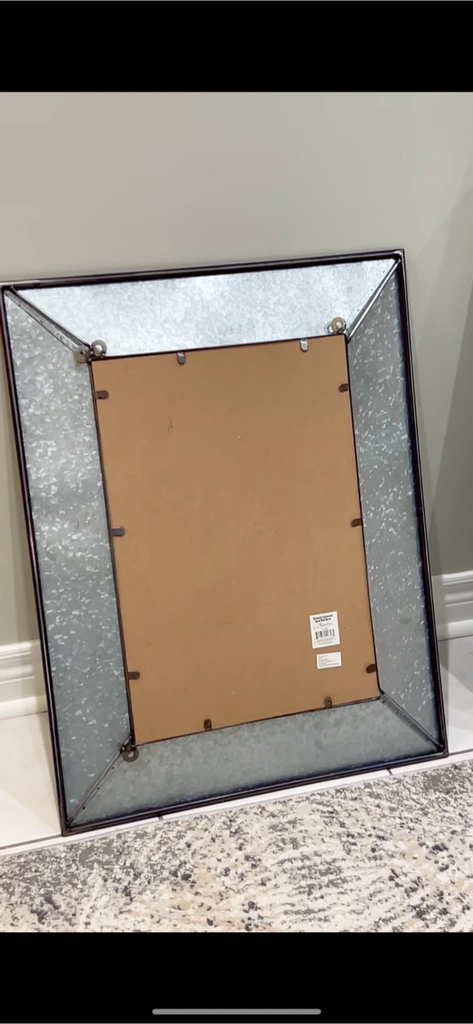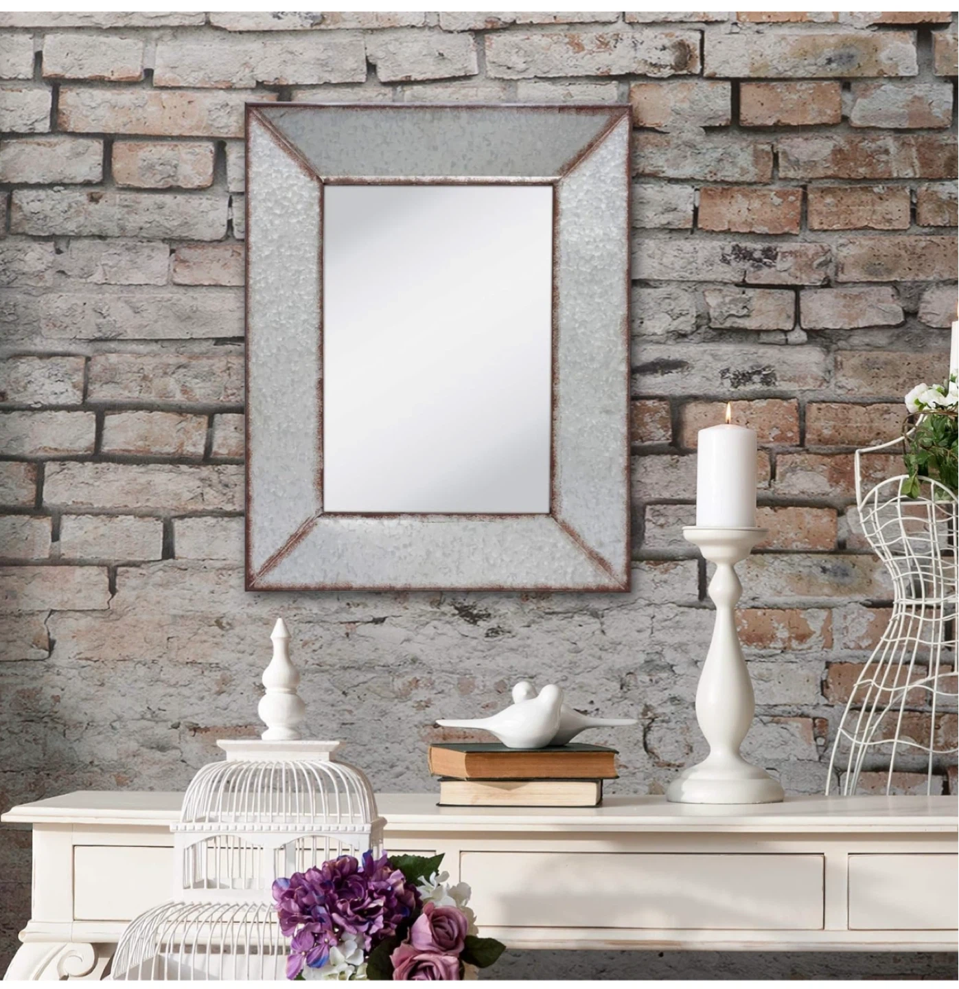 Add a touch of rustic charm to your home with this metal-framed mirror! The frame has a galvanized metal look with a slightly distressed, rusty edge. Dimensions: - Height: 27.95 inches - Width: 22.05 inches - Mirror area: 13.18" x 19.09" Pickup bovaird and Great Lakes Brampton