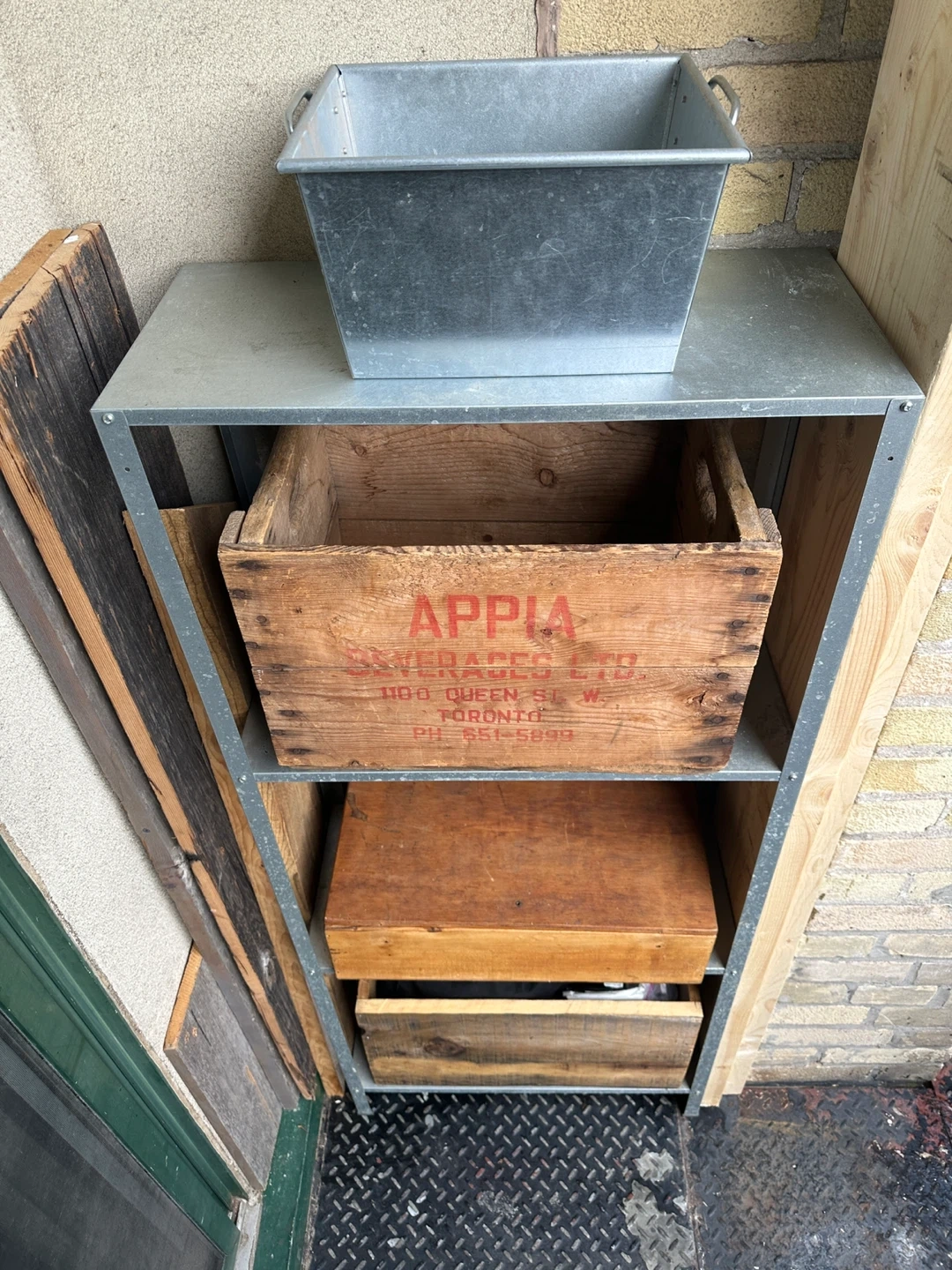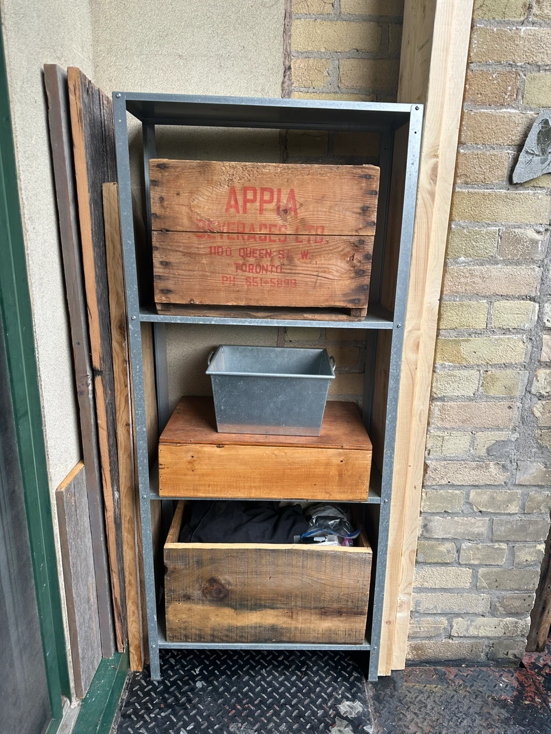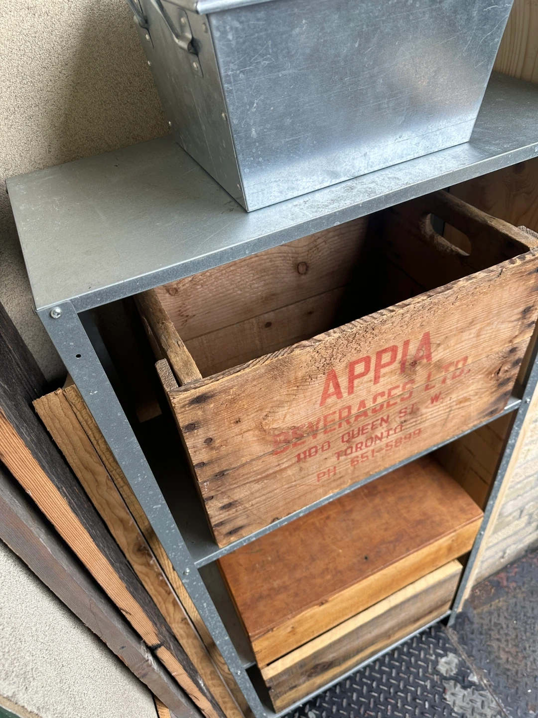 Shelf comes with 3 wood boxes + 1 steel box. Great for vtg display. 60 x 11 x 25” FRIENDLY BUYER TIPS Pickup king bathurst area or uber courier. First come first serve. Etrans required to hold. Pls view my other ads. Thank you.