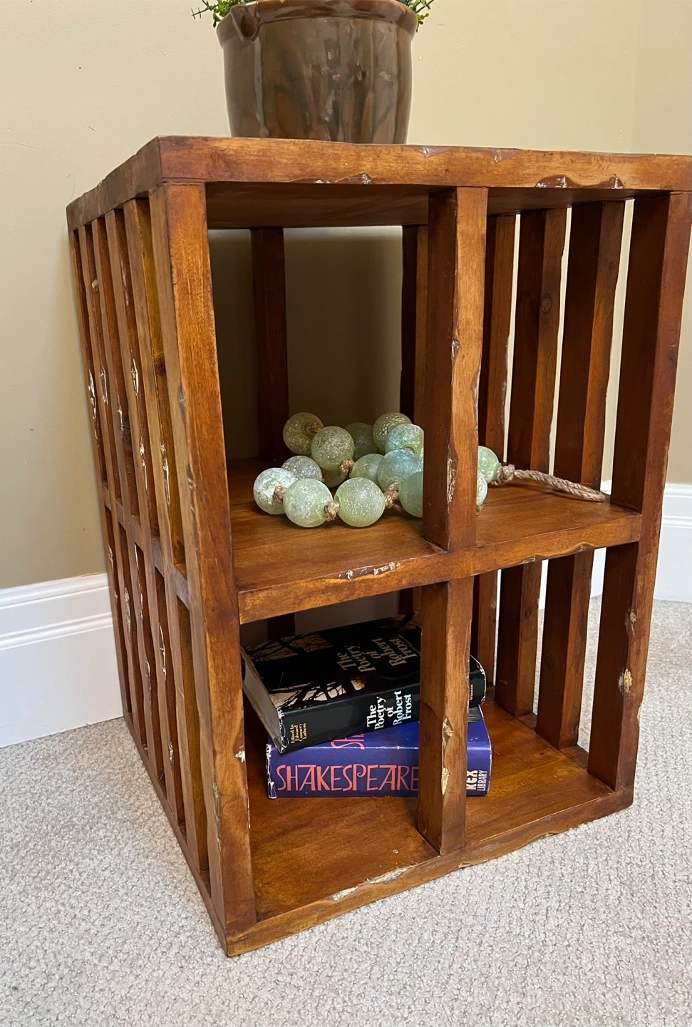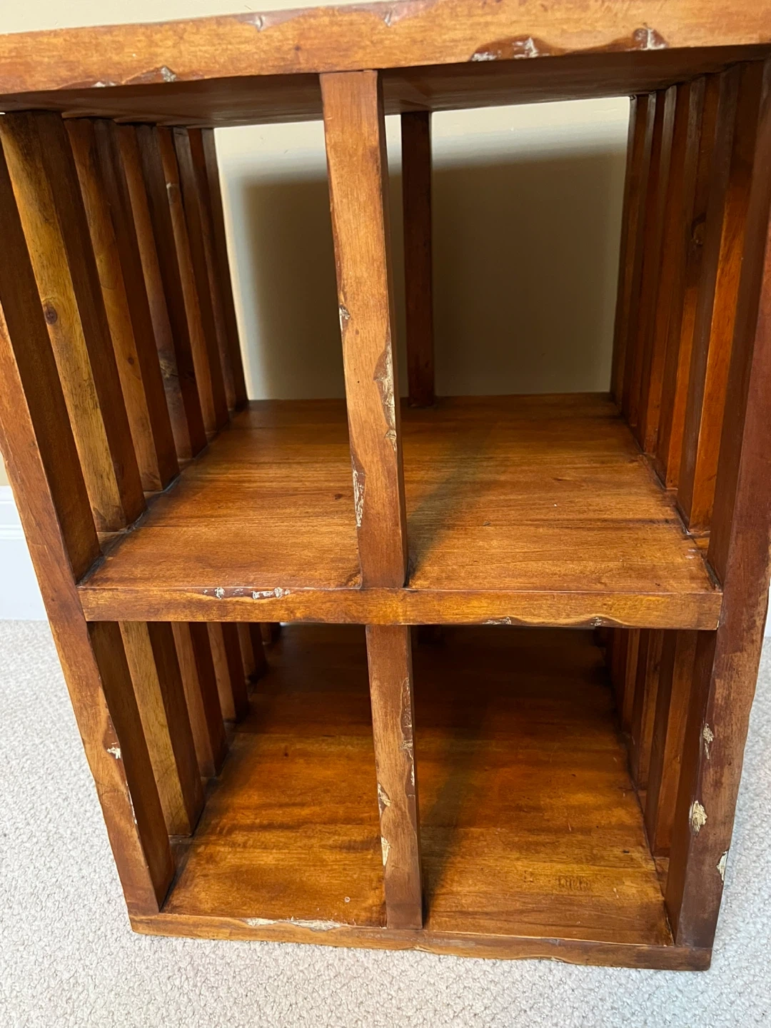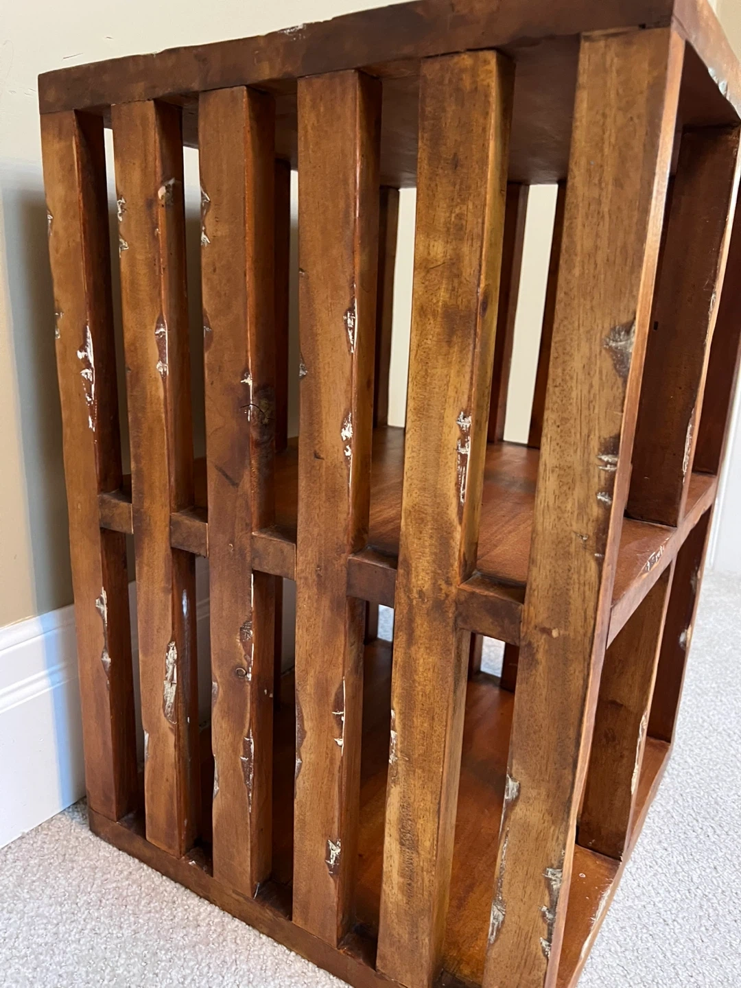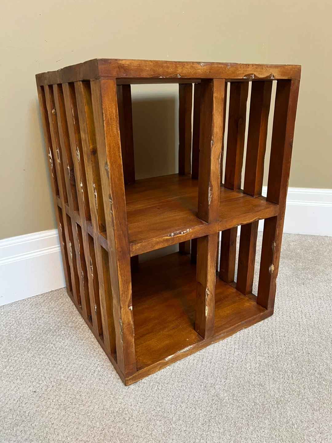Most likely Sheeham wood Distressed finish with rustic appearance Open design Like new condition Non smoking home Made in Indonesia Great as side/end table, bookshelf or a nightstand … From your living room to your bedroom and anywhere else you need little bit of unique storage 23.25” H x 16.5” W x 15.75” D Asking $65 Interested? Message me and please check my other listings…