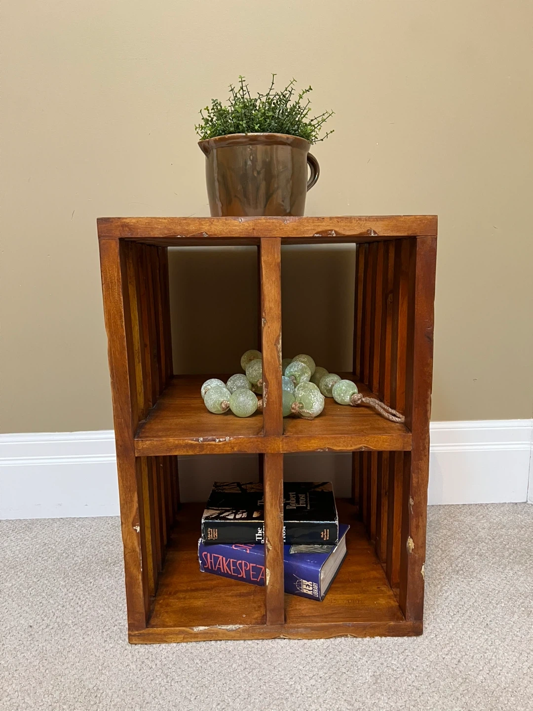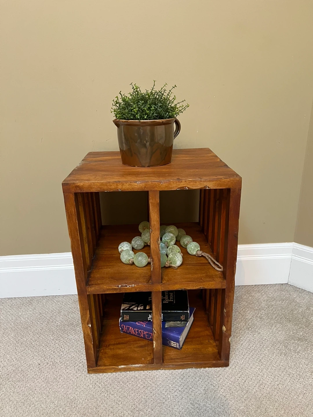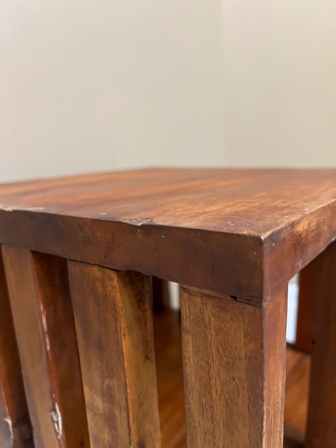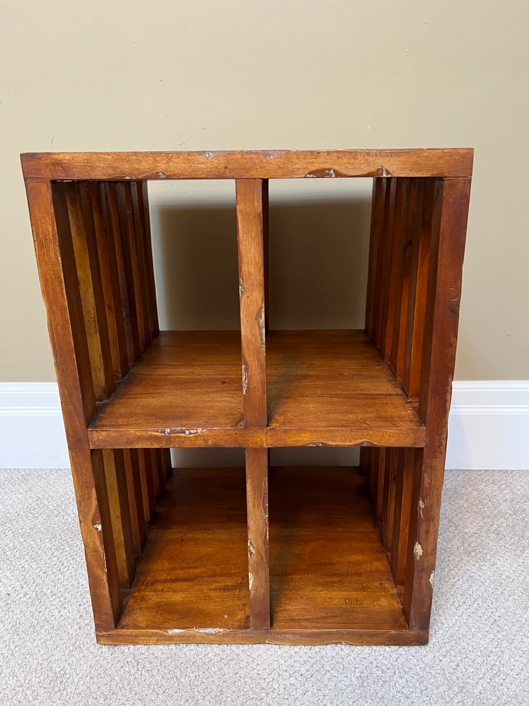 Most likely Sheeham wood Distressed finish with rustic appearance Open design Like new condition Non smoking home Made in Indonesia Great as side/end table, bookshelf or a nightstand … From your living room to your bedroom and anywhere else you need little bit of unique storage 23.25” H x 16.5” W x 15.75” D Asking $65 Interested? Message me and please check my other listings…