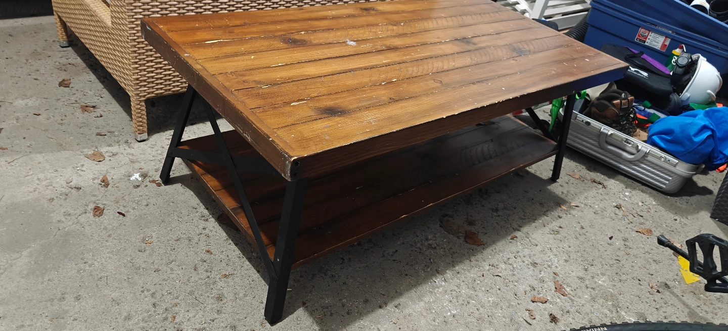 Sturdy coffee table. Features a reclaimed wood top and a lower shelf. Black metal frame. Great for a rustic or industrial style living room. Can deliver within Toronto, Vaughan, or Markham for an additional $20.