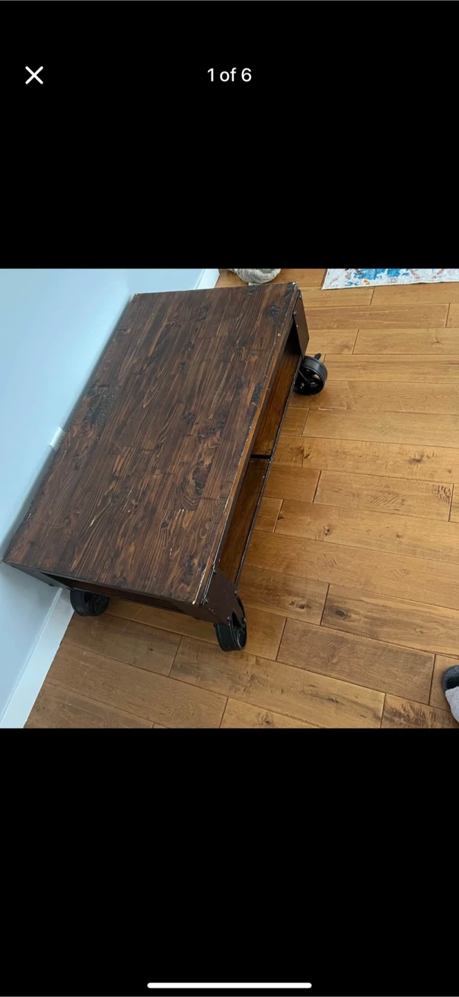 Selling a rustic-style coffee table. It's made of wood and has a dark brown finish. It has wheels, making it easy to move around. Perfect for adding a touch of vintage charm to your living room! And matching two side tables!