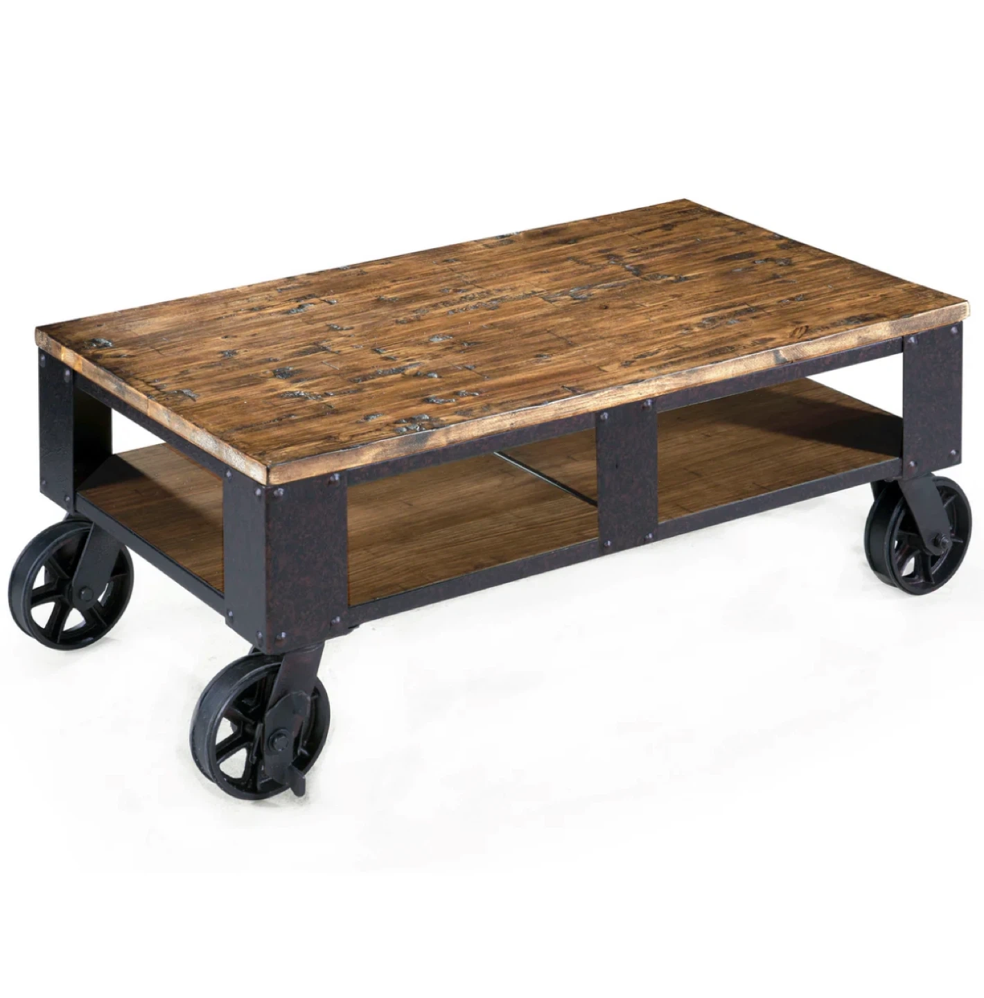 This is a rustic-style coffee table with a wood top and metal frame. It features wheels for easy movement and a lower shelf for storage or display. It would be a great addition to any living room or den!