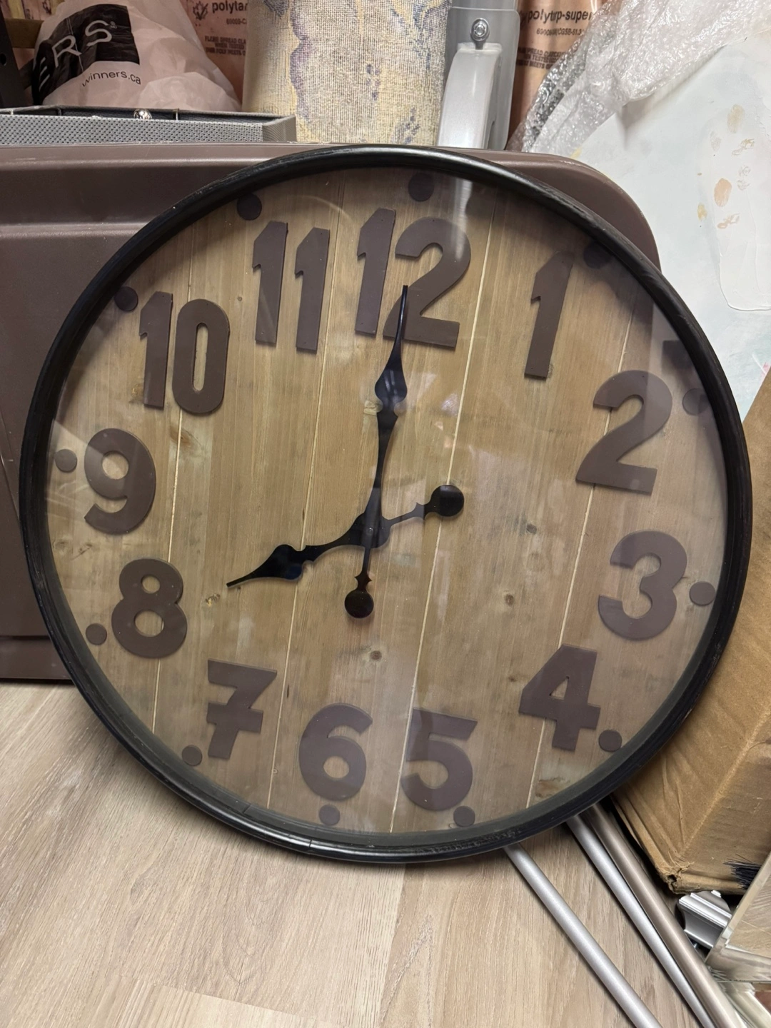Selling a rustic-style wall clock with a wood-look face and large, easy-to-read numbers. It has a black frame and would look great in a kitchen or living room!