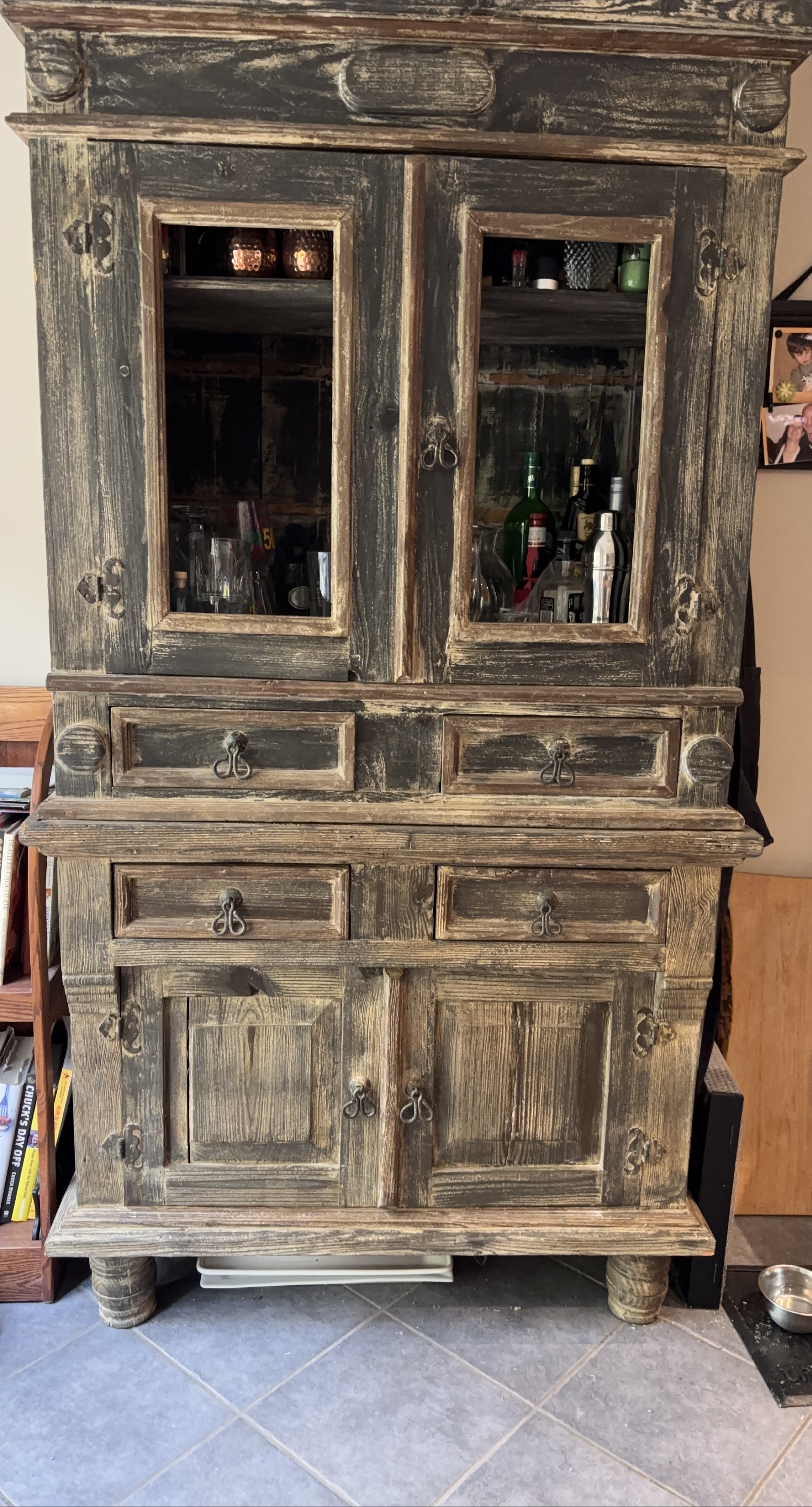 Selling a rustic wooden display cabinet. It features open pane doors on the upper section and drawers and cabinets on the separate lower section. It's perfect for showcasing your favourite items or storing essentials. The cabinet has a unique, weathered look that adds country character to any room. Would work also for a small tv 📺