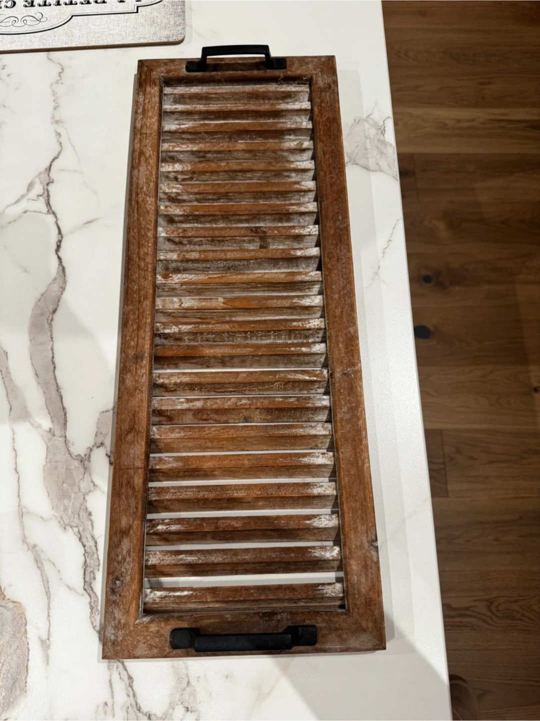 Selling a rustic wooden tray with black handles. It has a unique, weathered look that would be perfect for adding a touch of charm to your home decor! It could be used for serving or as a decorative piece