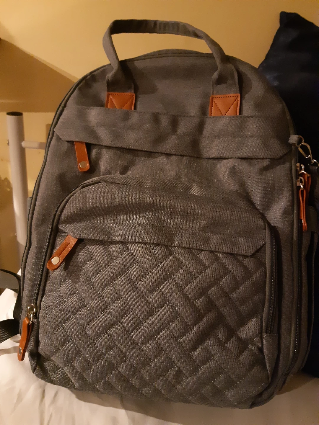 Looking to sell this RUVALLINO diaper bag backpack in grey! It's a large multifunction travel pack perfect for parents on the go. It has lots of space for baby's needs. Features include insulated bottle pockets and detachable pacifier case.