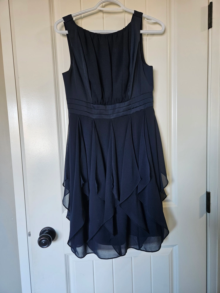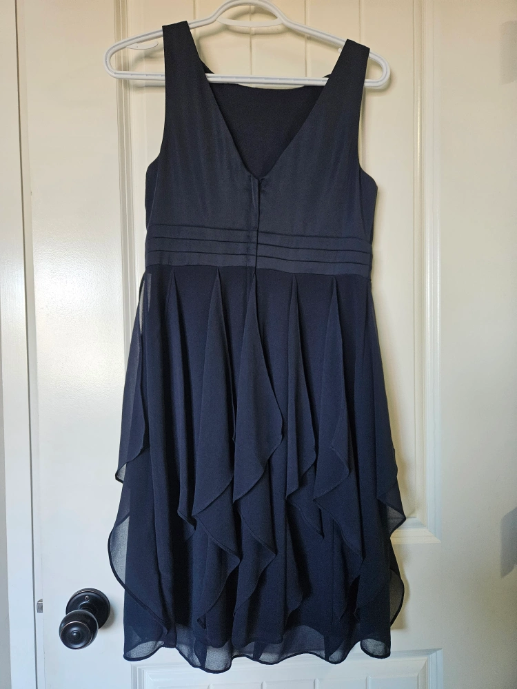 A sleeveless navy blue dress with a layered skirt, a fitted bodice, and a v-neck. The dress has a zipper closure in the back.