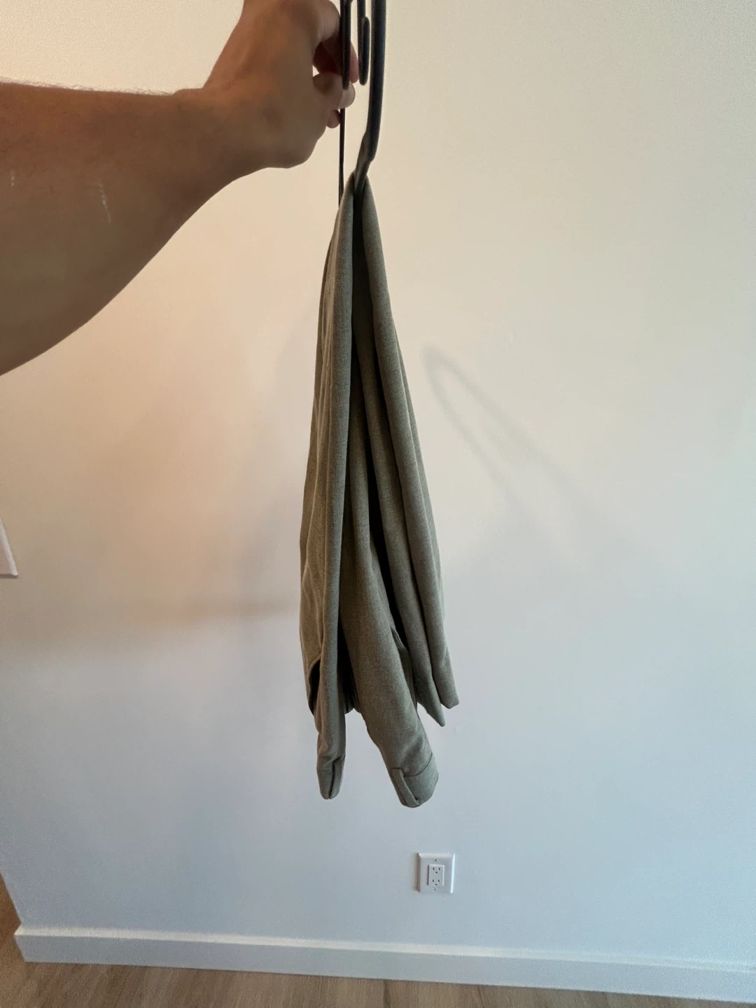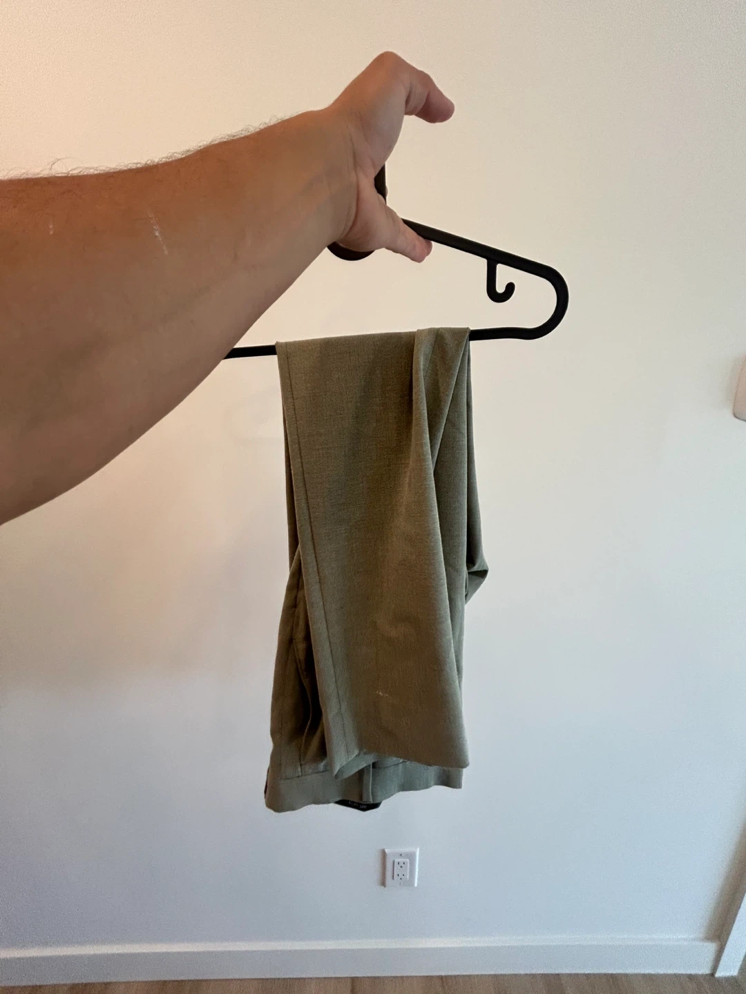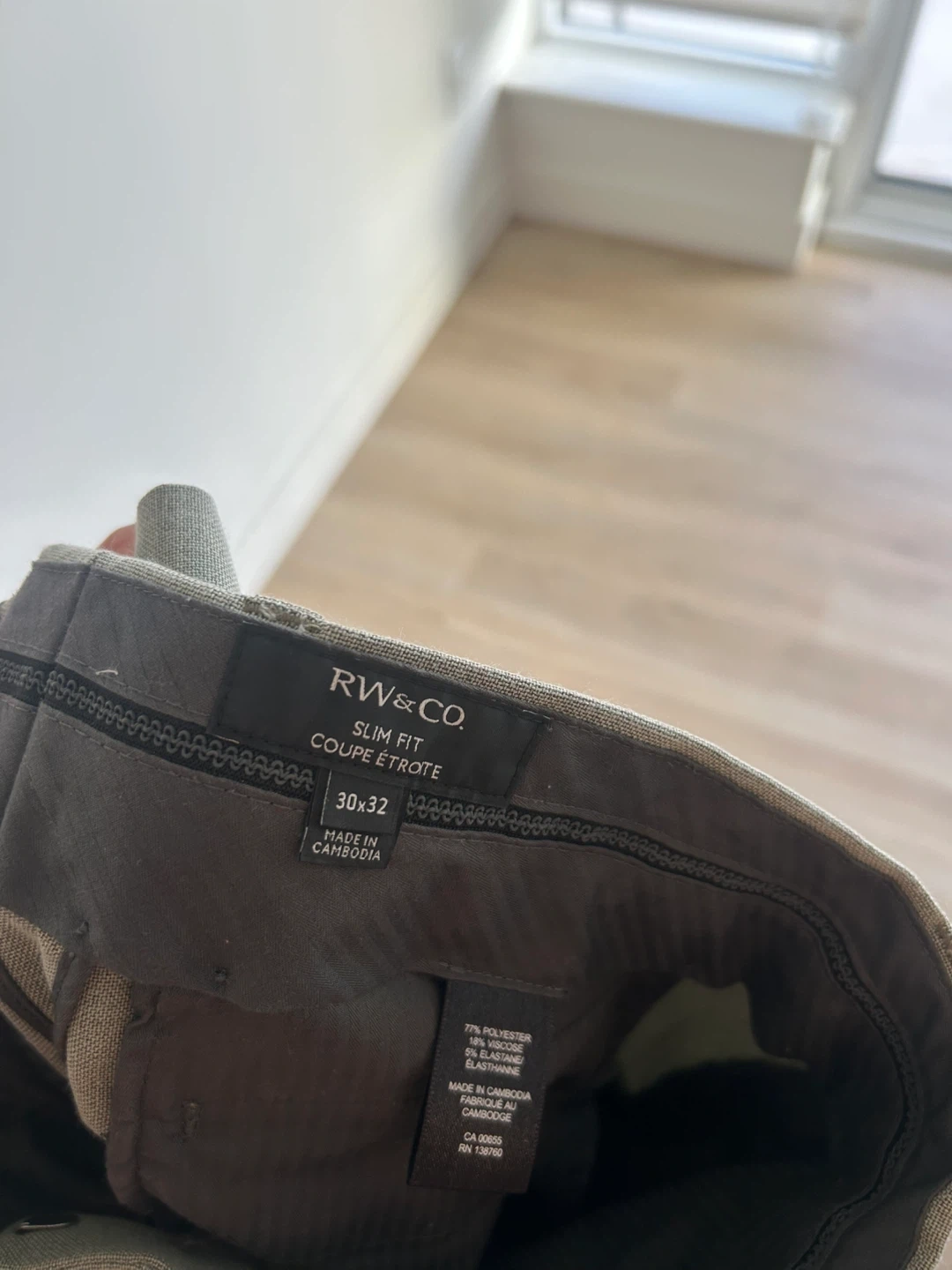 Selling a pair of RW&CO. slim fit pants in size 30x32. They are a nice neutral colour and made of 77% polyester, 18% viscose, and 5% elastane. Perfect for dressing up or down!
