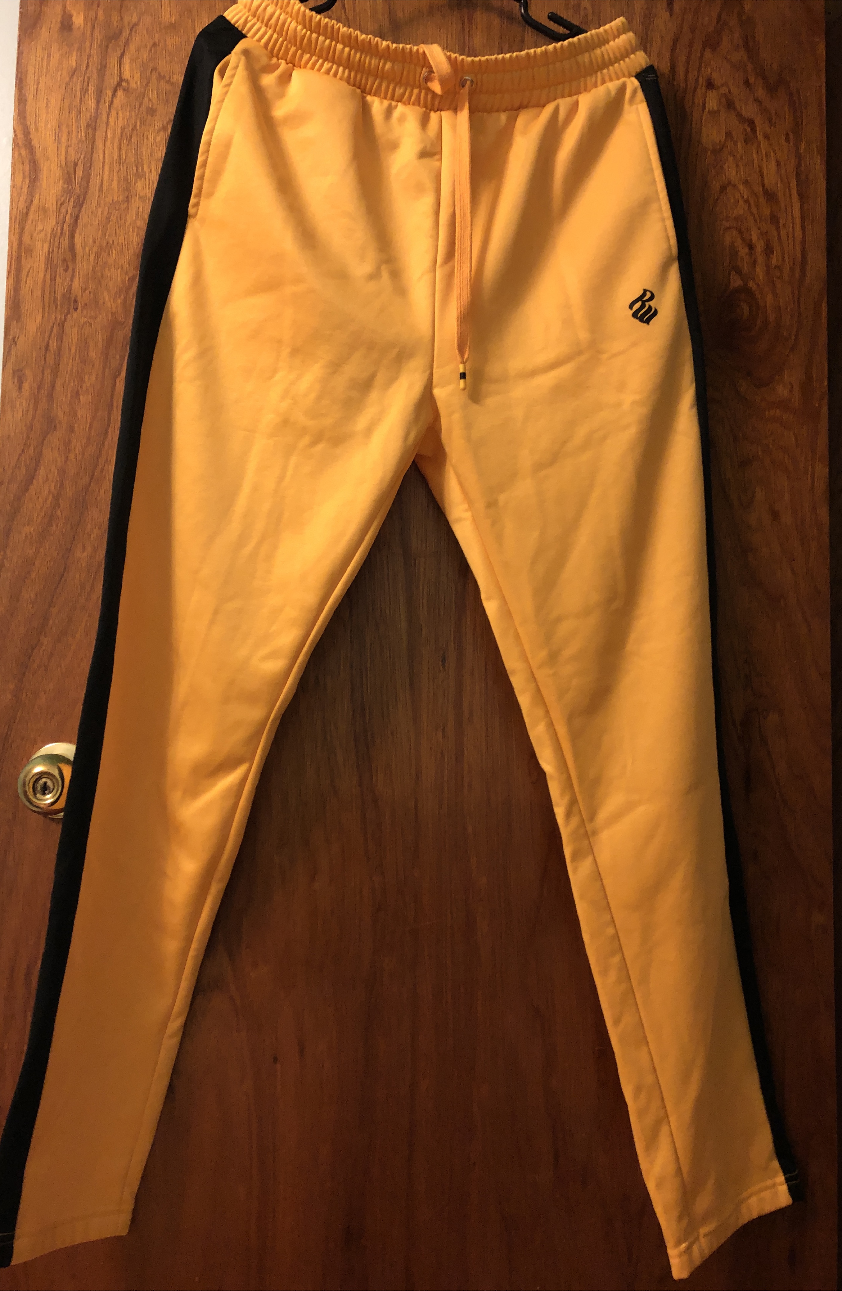 Selling a pair of yellow track pants with a black stripe down the side! They have a drawstring and the RW logo on the front Pickup from Christie station between 4:30pm and 8:00pm during the week days