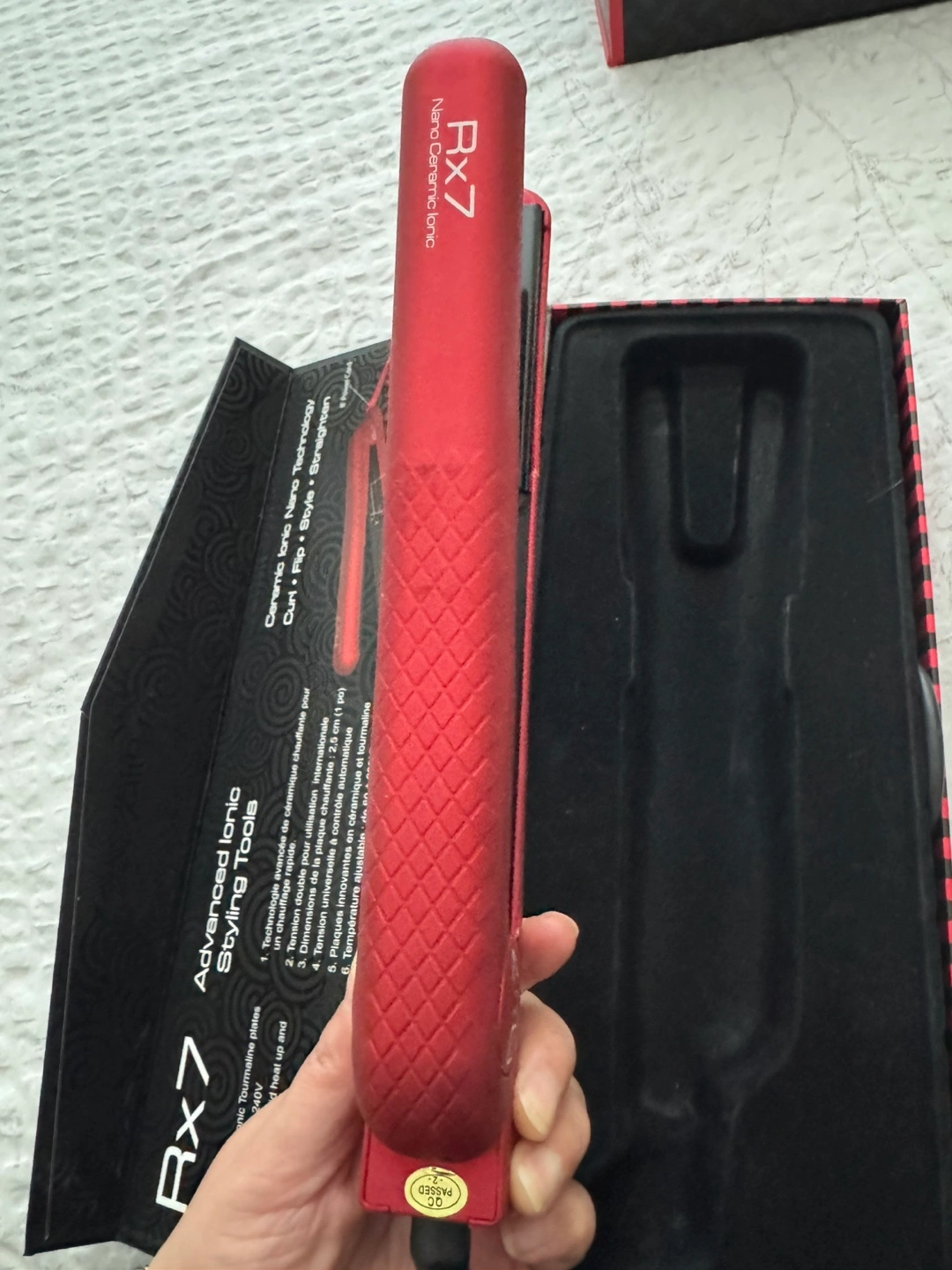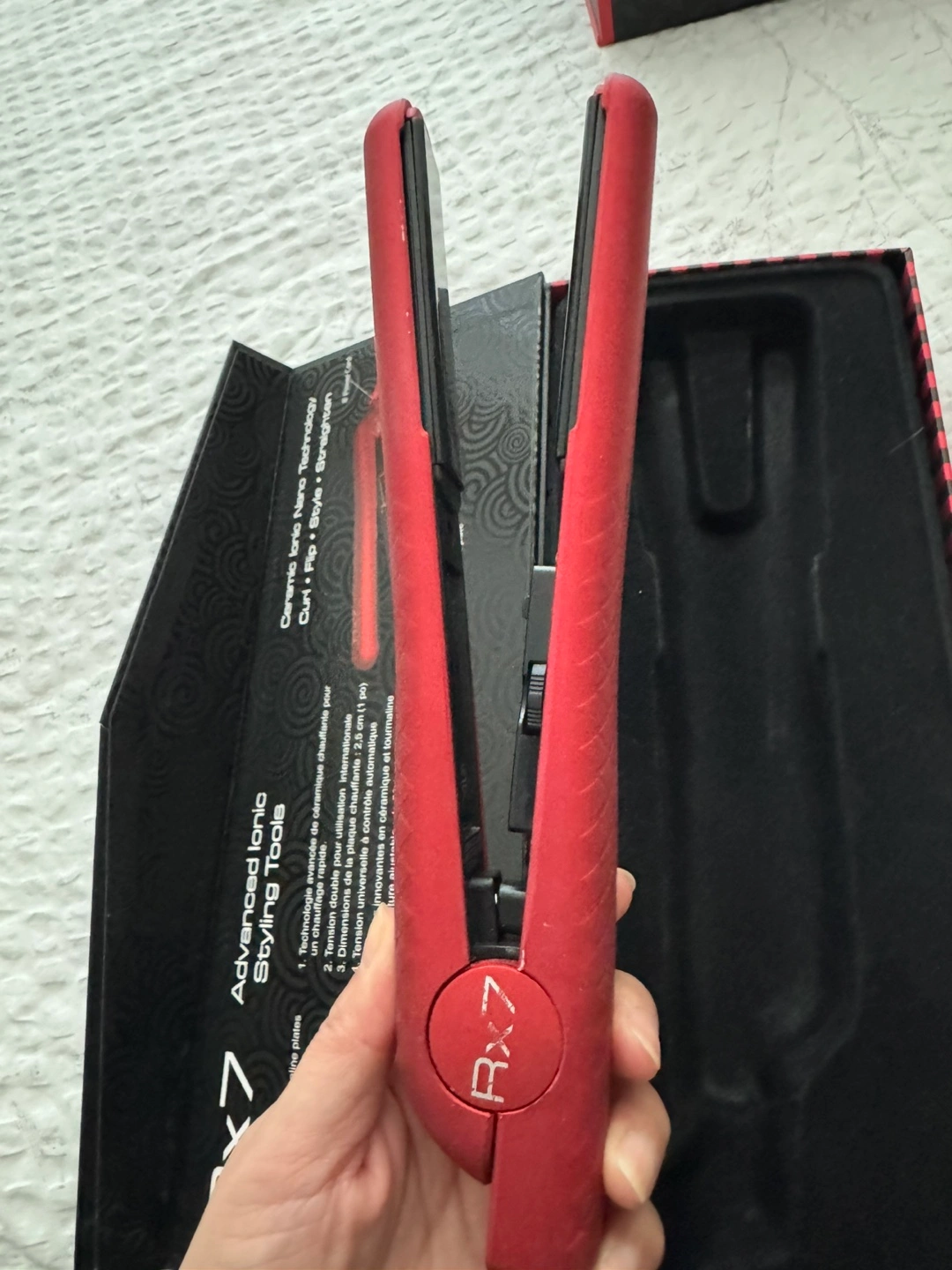 Selling a Rx7 Advanced Ionic Styling Tool in red. It features ceramic ionic nano technology for curling, flipping, and straightening. This styling tool is designed with universal voltage and comes with its original box