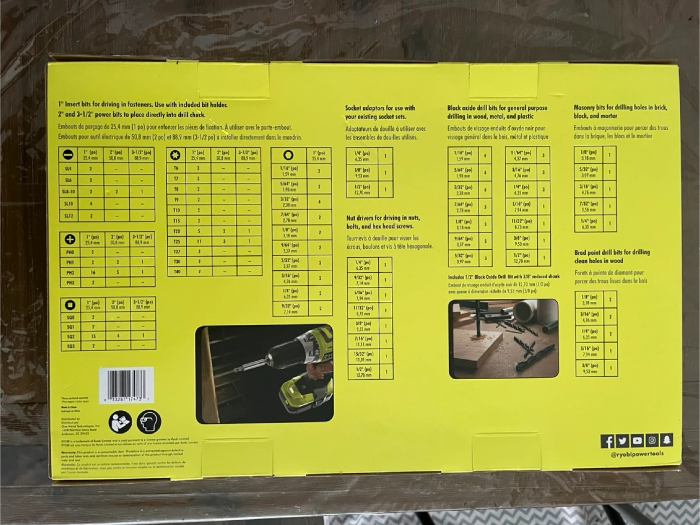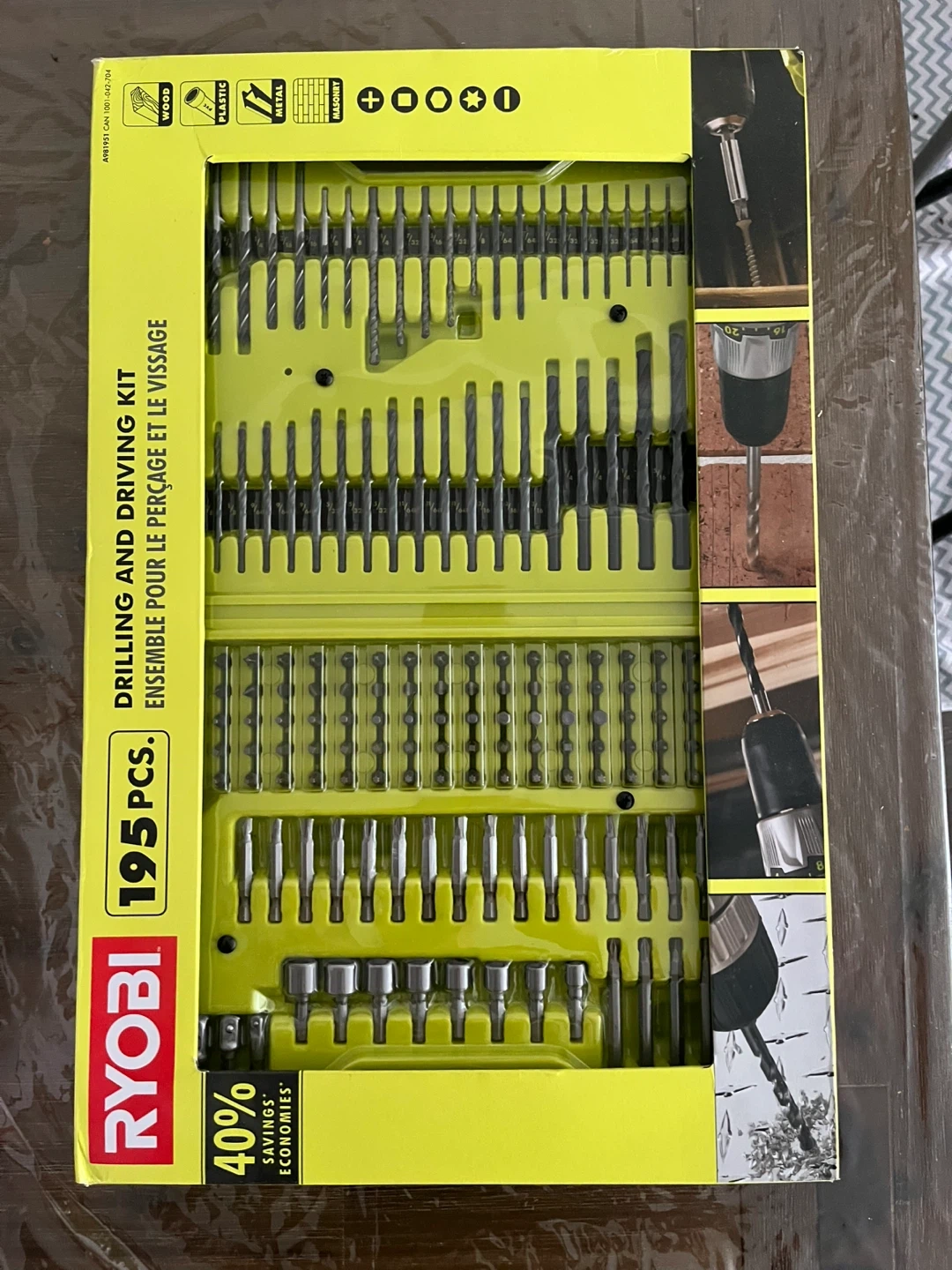 Ryobi 195-piece drilling and driving kit for all your drilling needs! Includes bits for driving in fasteners with included bit holder, socket adaptors for use with your existing socket sets, black oxide drill bits for general purpose drilling in wood, metal and plastic, and masonry bits for drilling holes in brick, block and mortar