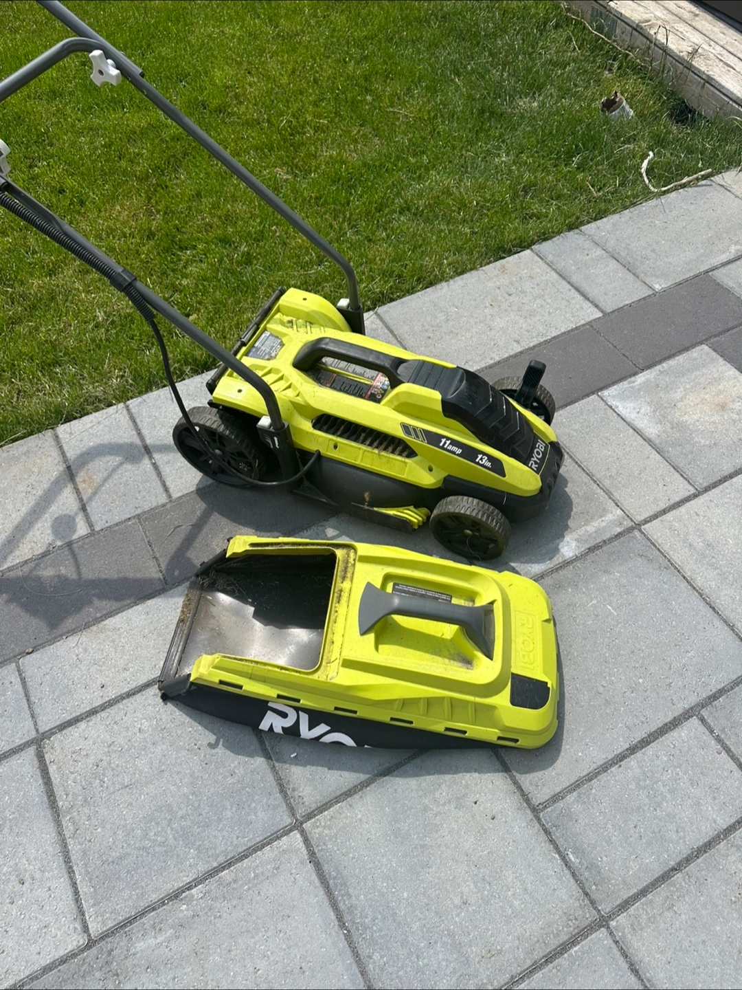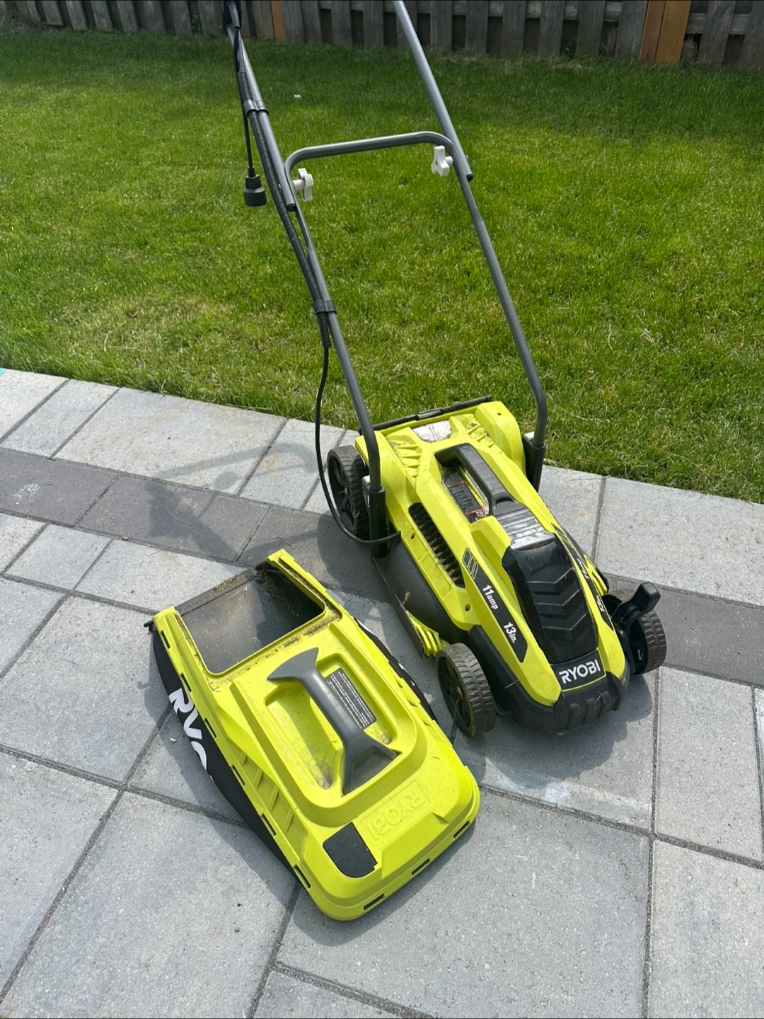 Lawn mower. The mower and grass catcher are both in matching colours. This mower would be perfect for a peaceful afternoon spent in your yard.