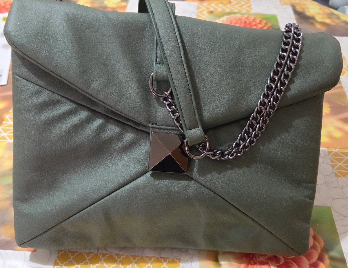 Joli sac à main de couleur vert olive, parfait pour compléter votre look! Il a une chaîne argentée qui ajoute une touche d'élégance. Idéal pour les sorties ou les occasions spéciales, il est en très bon état
