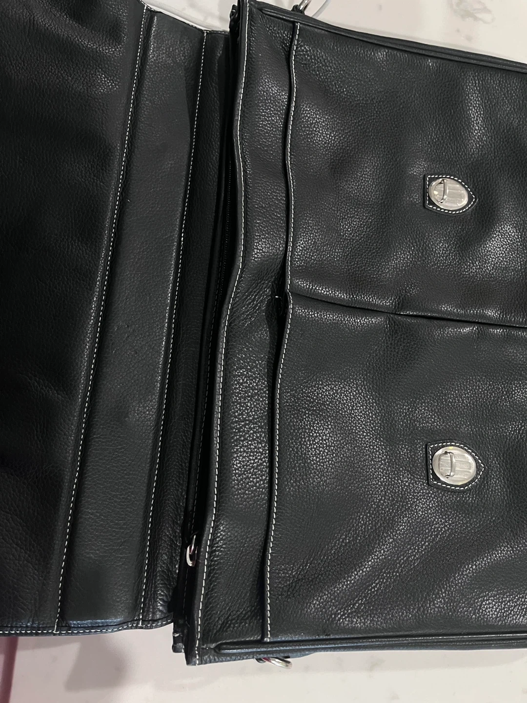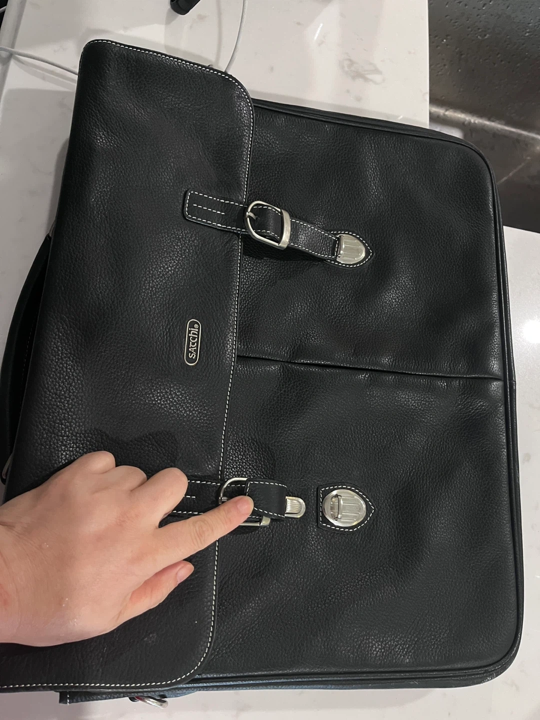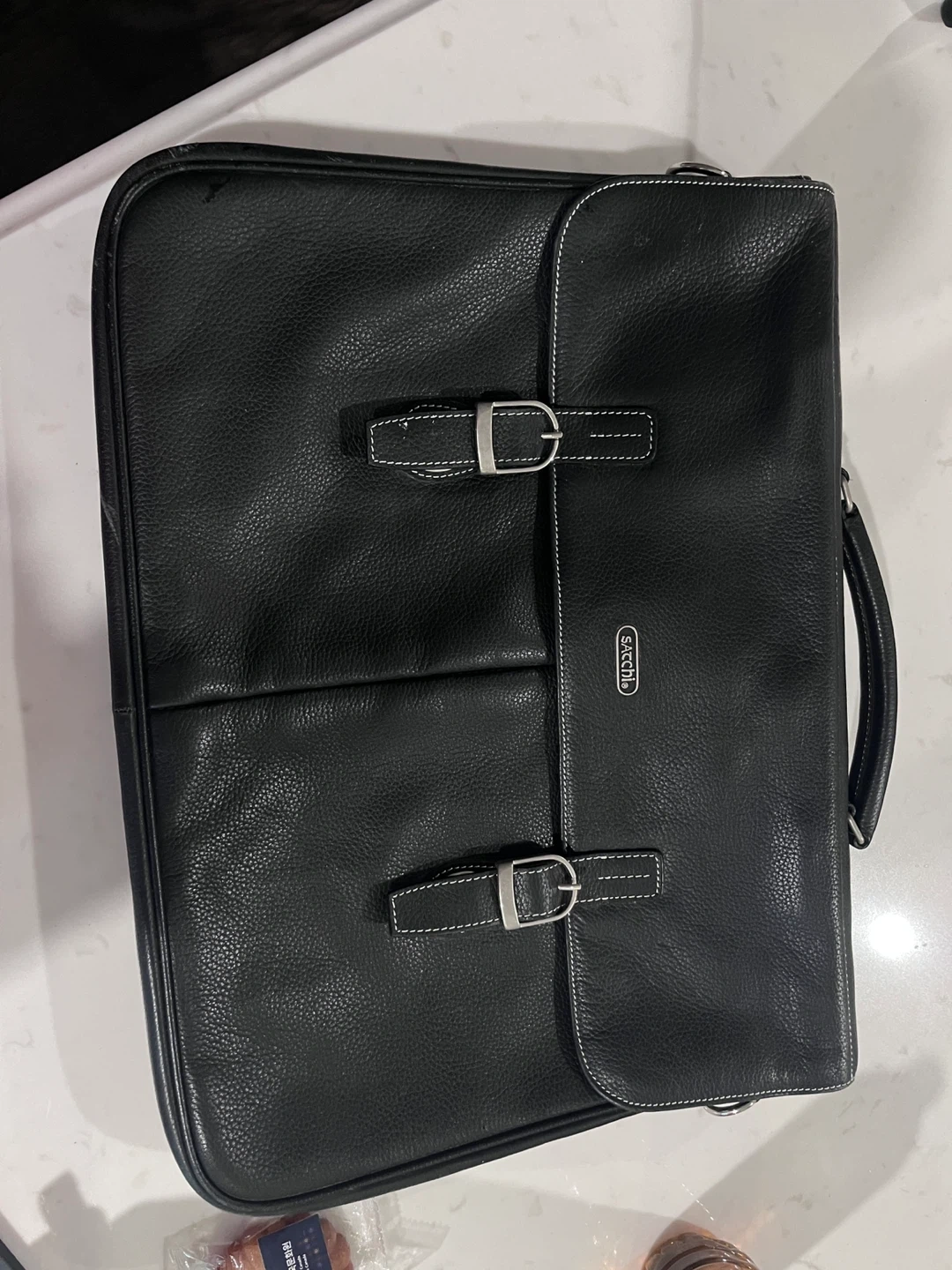 Selling a Sacchi black leather briefcase. It has a classic and professional look. The briefcase features multiple compartments and a secure closure, perfect for carrying documents and essentials. It's in great condition and ready for a new owner!