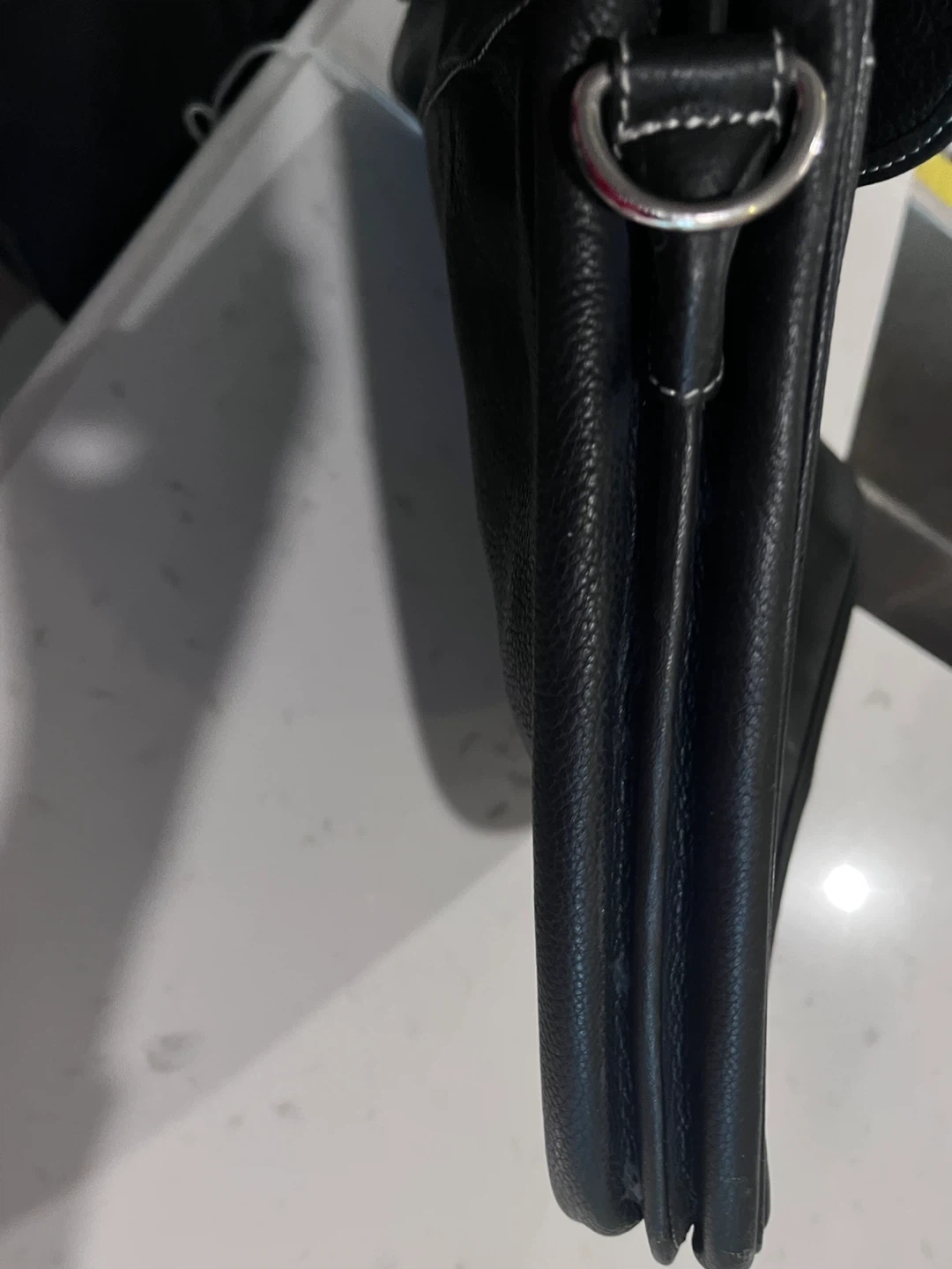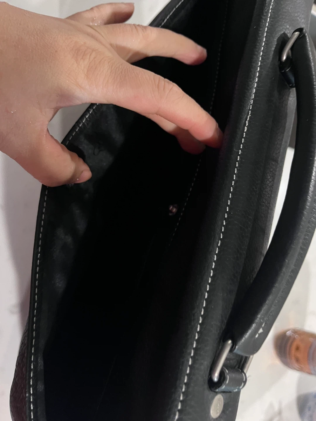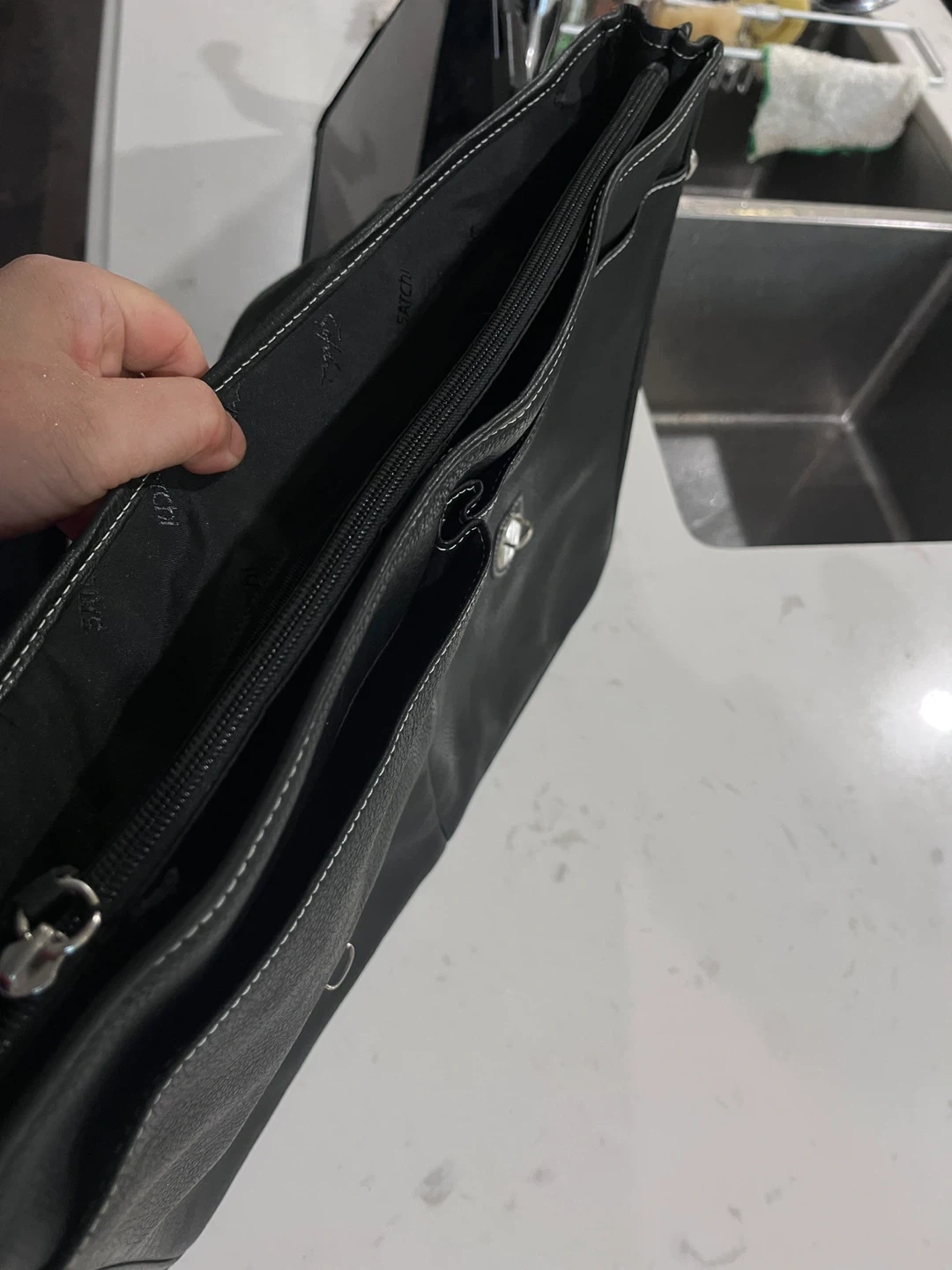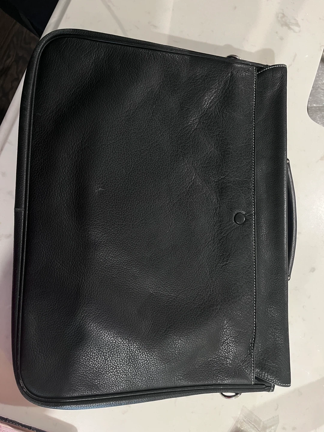 Selling a Sacchi black leather briefcase. It has a classic and professional look. The briefcase features multiple compartments and a secure closure, perfect for carrying documents and essentials. It's in great condition and ready for a new owner!