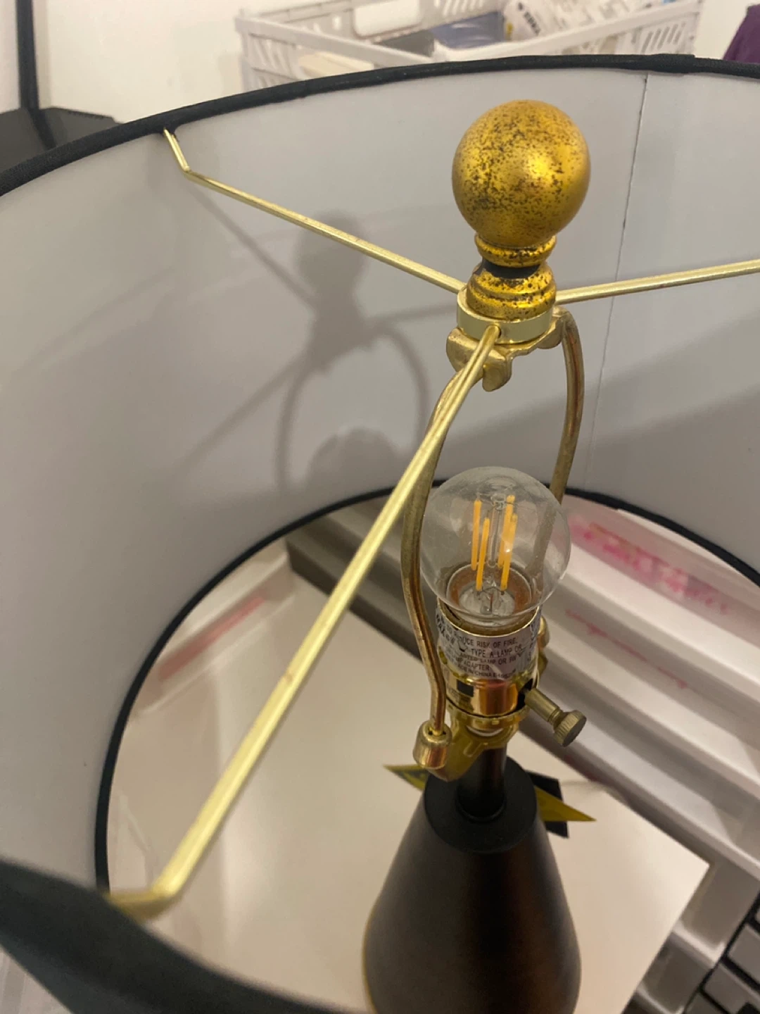 This is a Safavieh table lamp. It features a black shade and a gold-tone accent at the base.