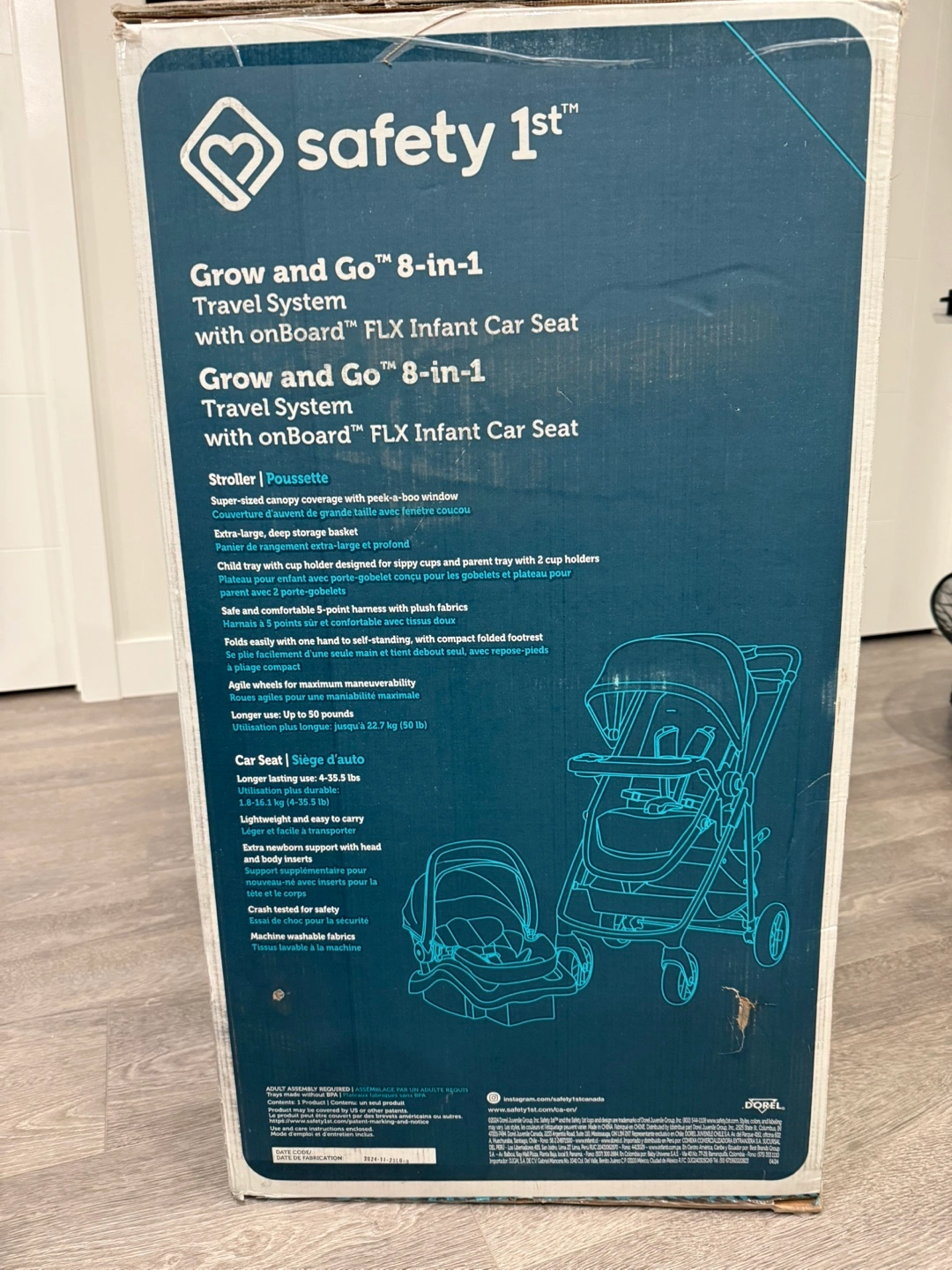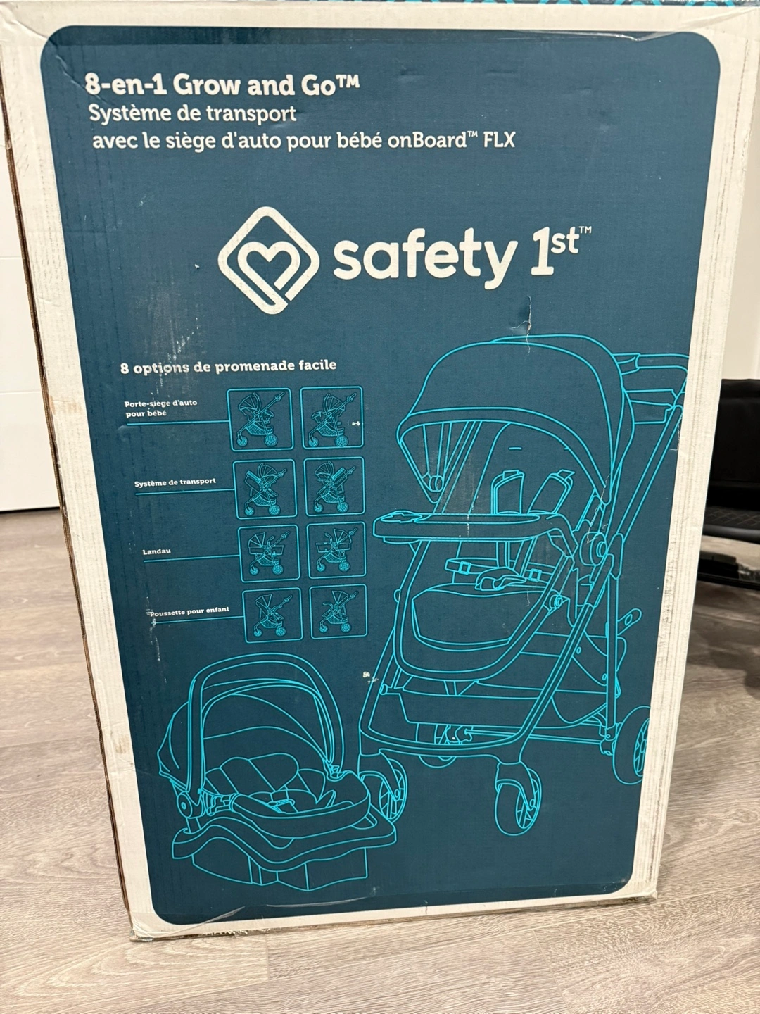 Selling a Safety 1st Grow and Go 8-in-1 Travel System! This travel system includes the OnBoard FLX Infant Car Seat. Key features include: - Extra-large, deep storage basket - Child tray with cup holder designed for sippy cups and parent tray with 2 cup holders - Sets of soft goods with plush fabrics - Folds easily with one hand to self-standing, with compact folded footprint - Car seat is crash tested for safety - Machine washable fabrics