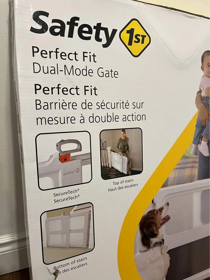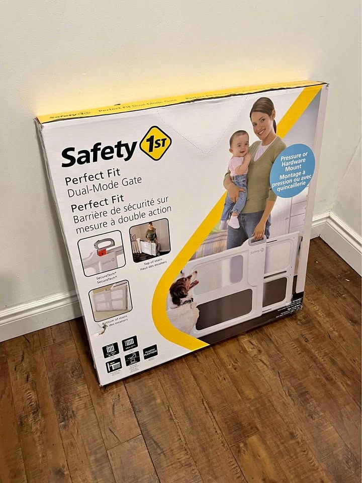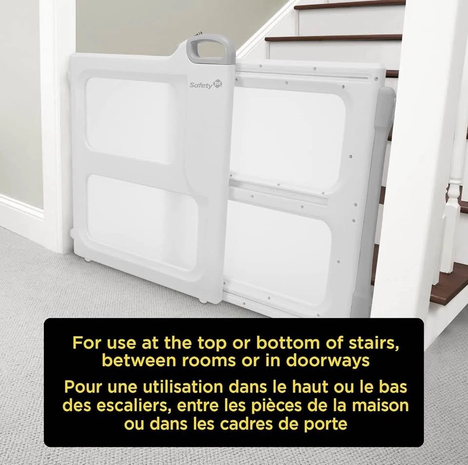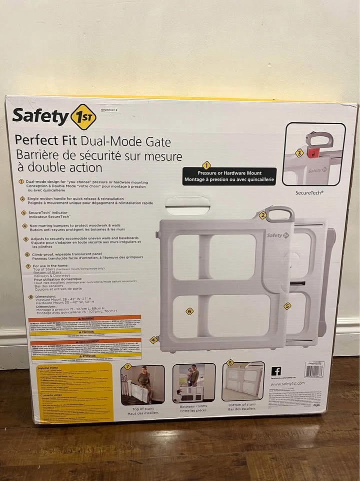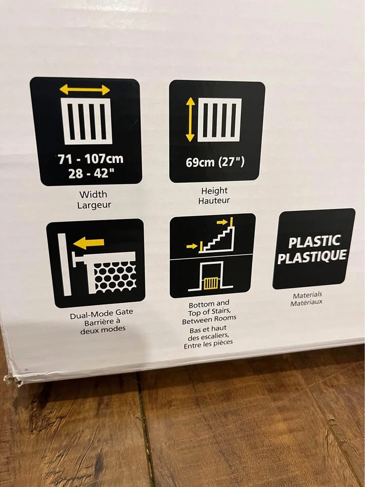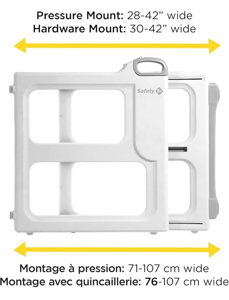Brand new, climb-proof, wipeable clear panel. Functions as pet gate. Pressure Mount: 28"-42" wide, 27"high. Hardware Mount: 30"-42" wide, 27" high. Perfect for children 6-24 months and great for pets too!